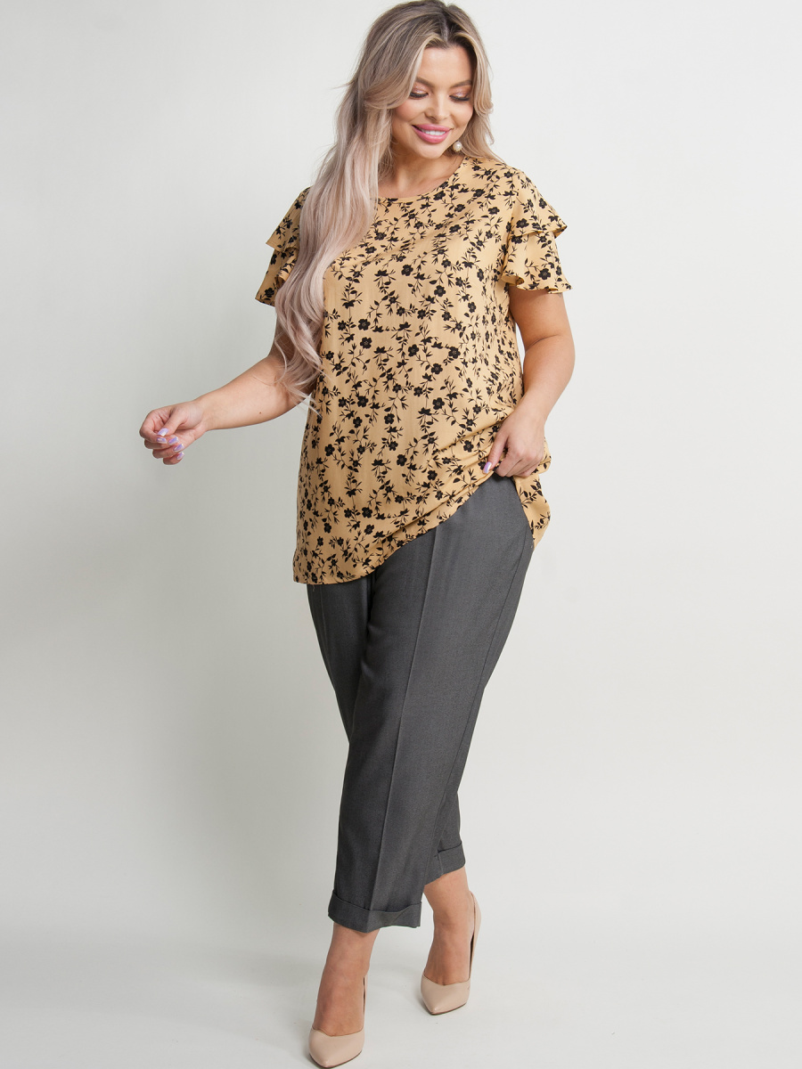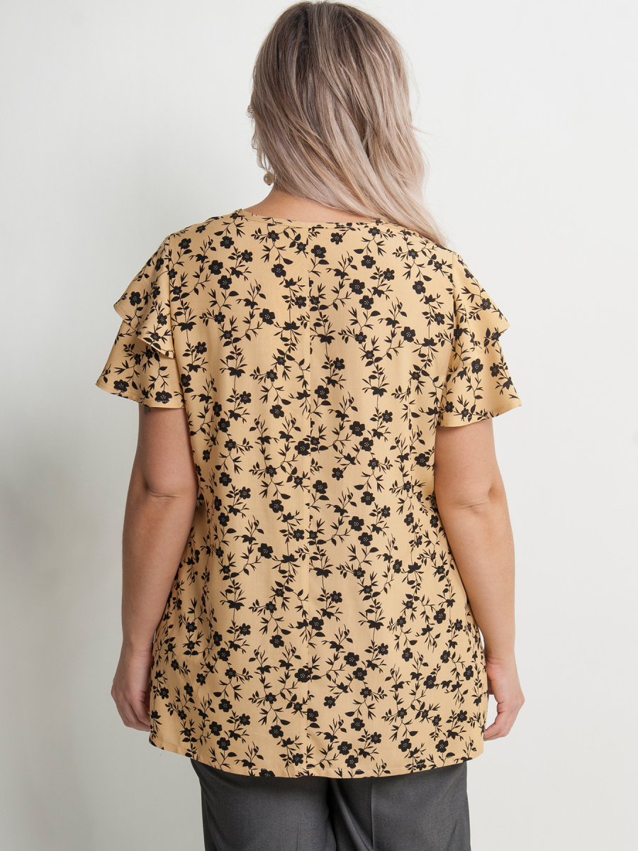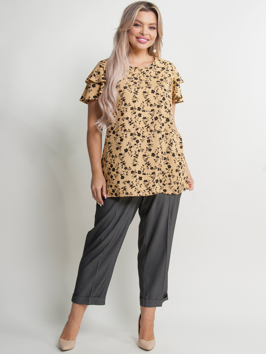 Блузка женская А-образного силуэта, выполненная из штапеля. Модель с круглым вырезом горловины и короткими рукавами с двойным воланом.Блузка отличается простым и лаконичным дизайном, благодаря чему легко сочетается с любыми другими элементами гардероба. Сделайте свой образ легким и стильным с этой блузкой!