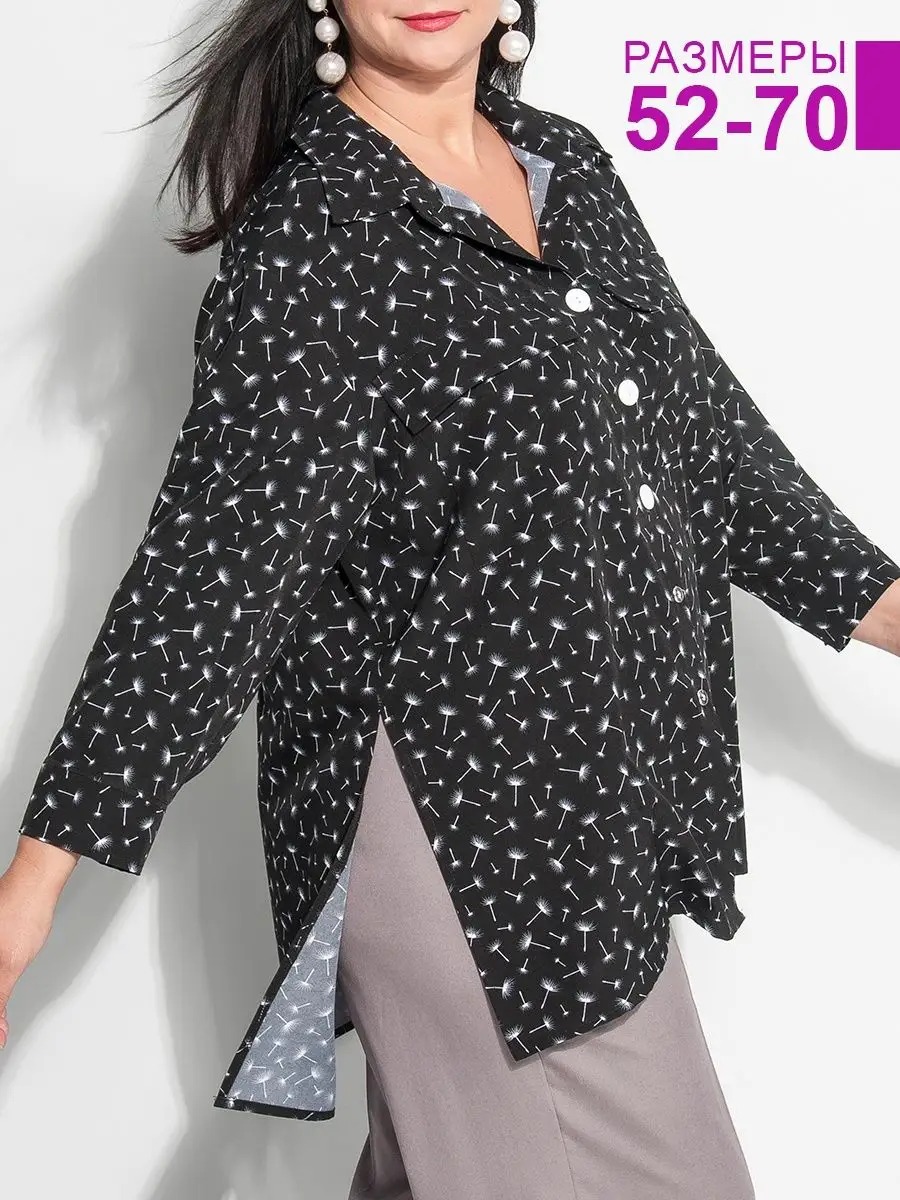 Рубашка женская прямого силуэта с удлиненной спинкой и боковыми разрезами. Модель имеет рубашечный отложной воротник и рукава 3/4 на манжете. С переди на уровне груди накладные карманы. По центру застежка на пуговицы. Сзади кокетка с центральной складкой.