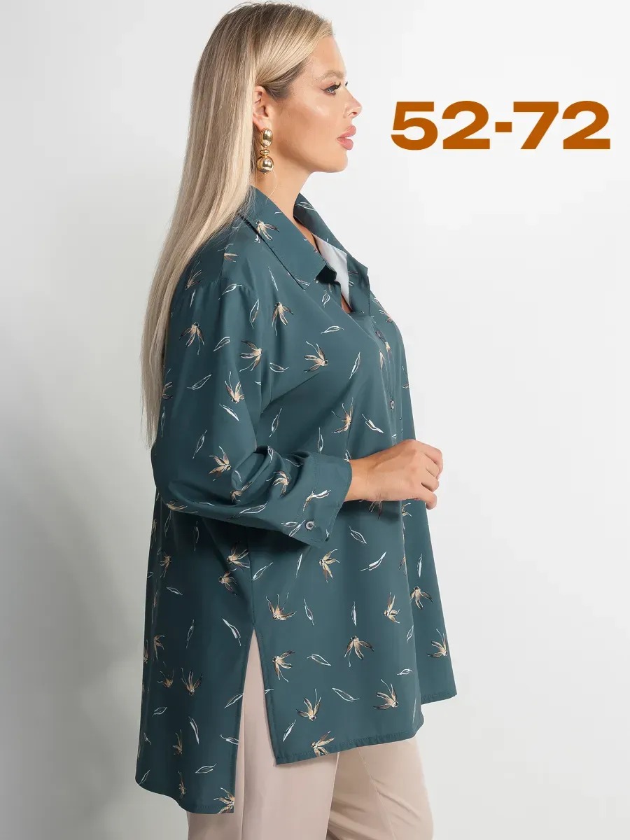 Рубашка женская прямого силуэта с удлиненной спинкой и боковыми разрезами. Модель имеет рубашечный отложной воротник и рукава 3/4 на манжете. По центру застежка на пуговицы. Сзади кокетка с центральной складкой.