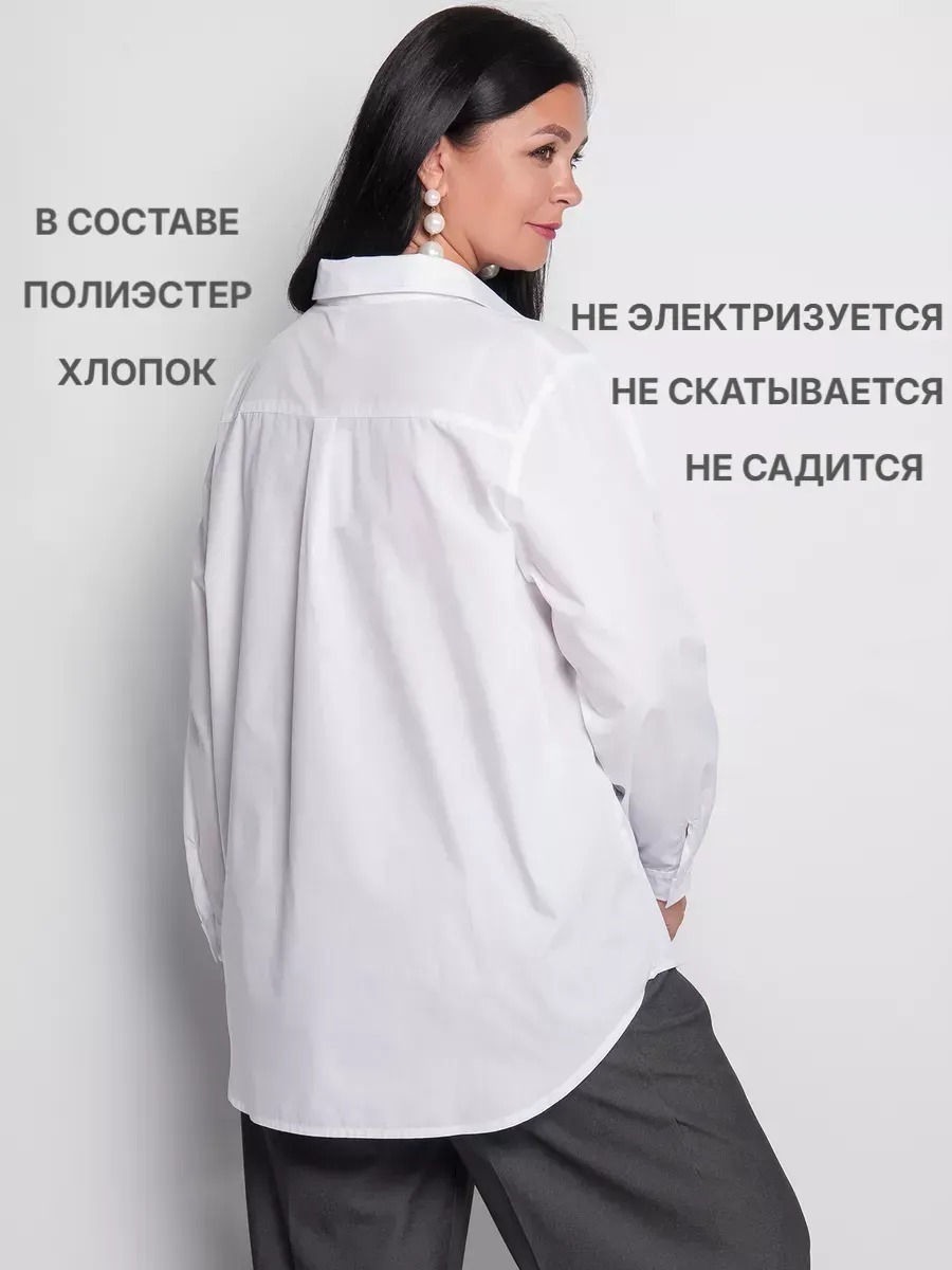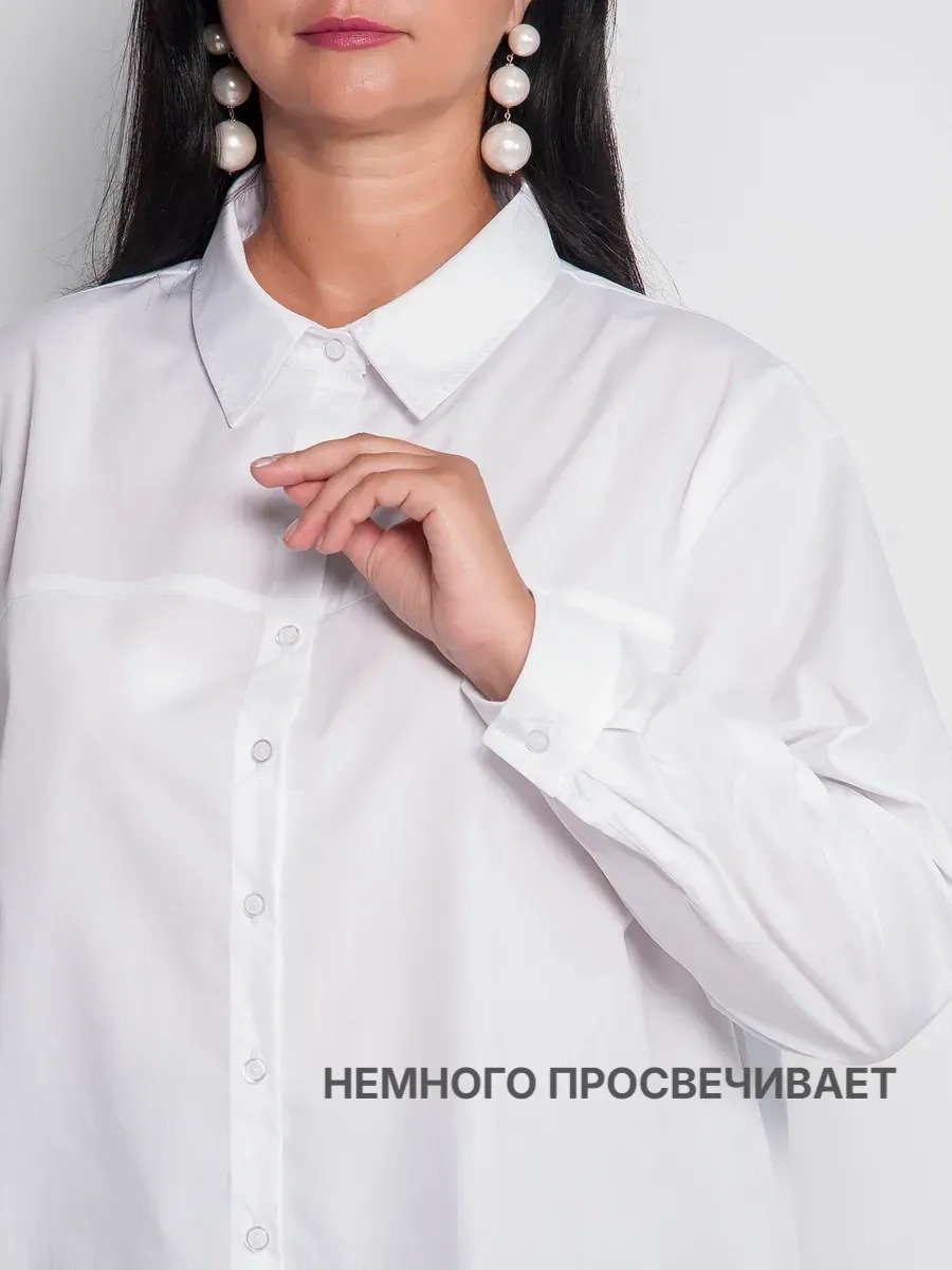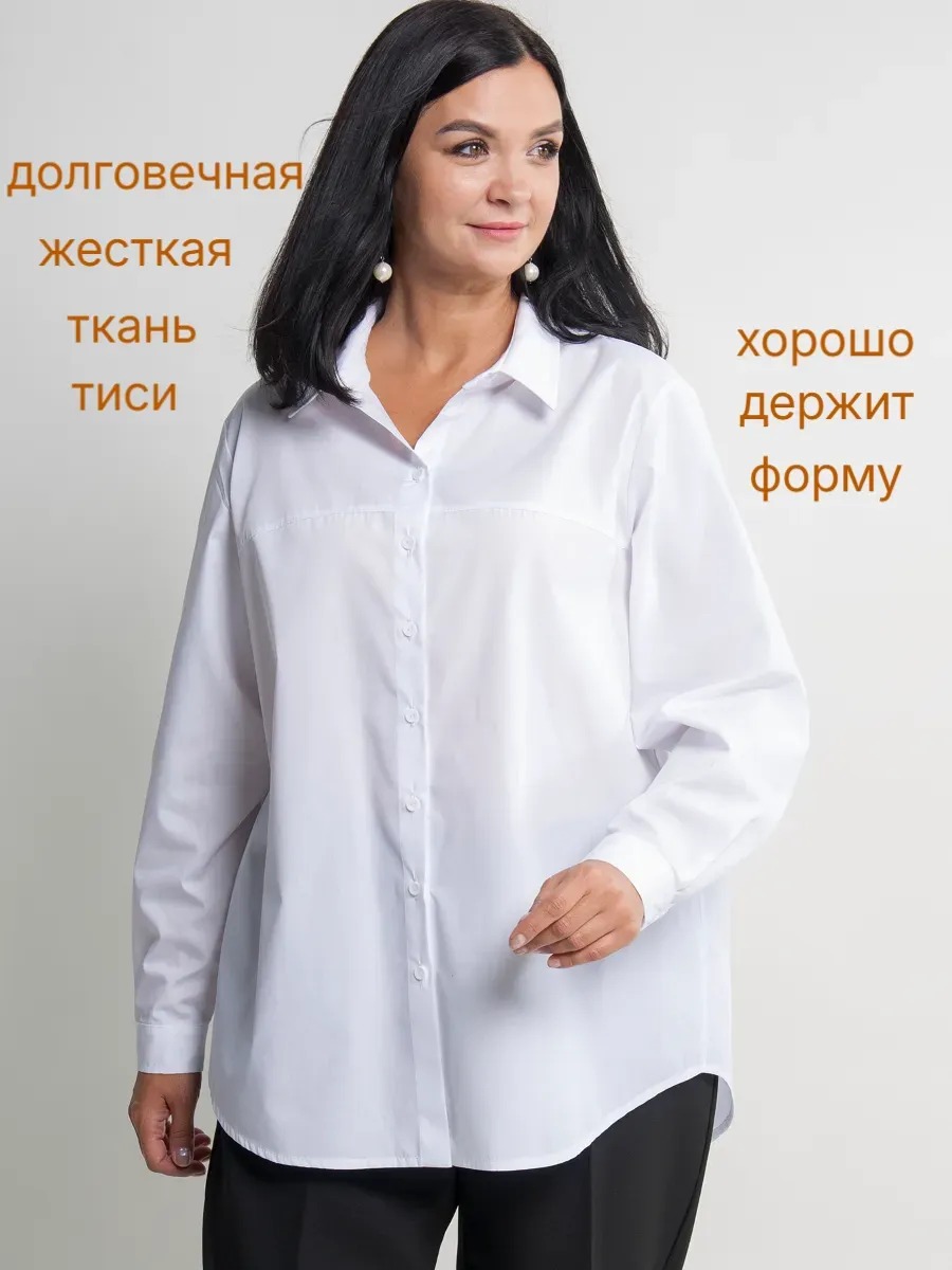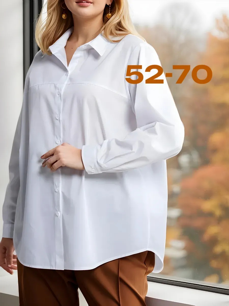 Рубашка женская прямого силуэта. Вырез горловины дополнен рубашечным воротником, длинные втачные рукава оформлены манжетами с пуговицами. По центру полочки – застежка на пуговицы. Низ фигурный, с закруглениями по бокам.