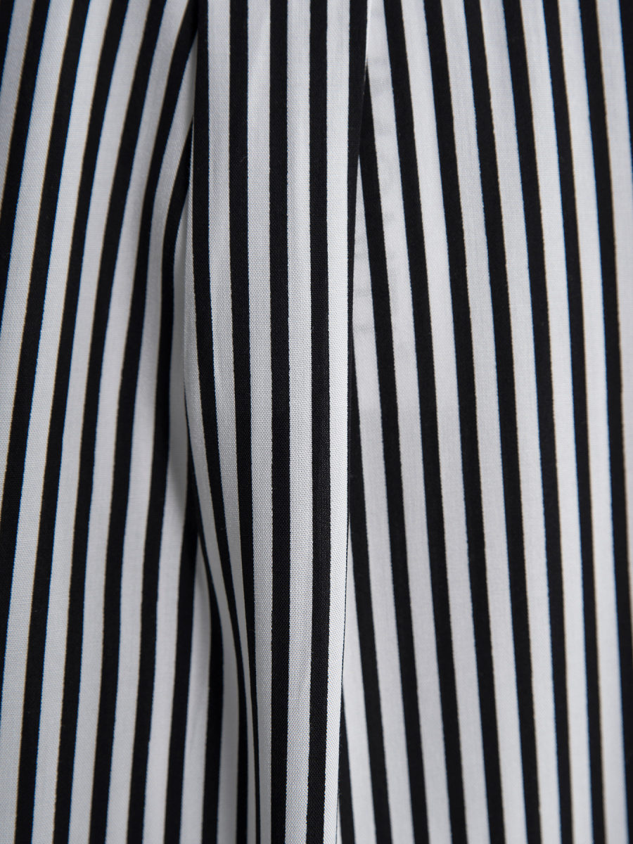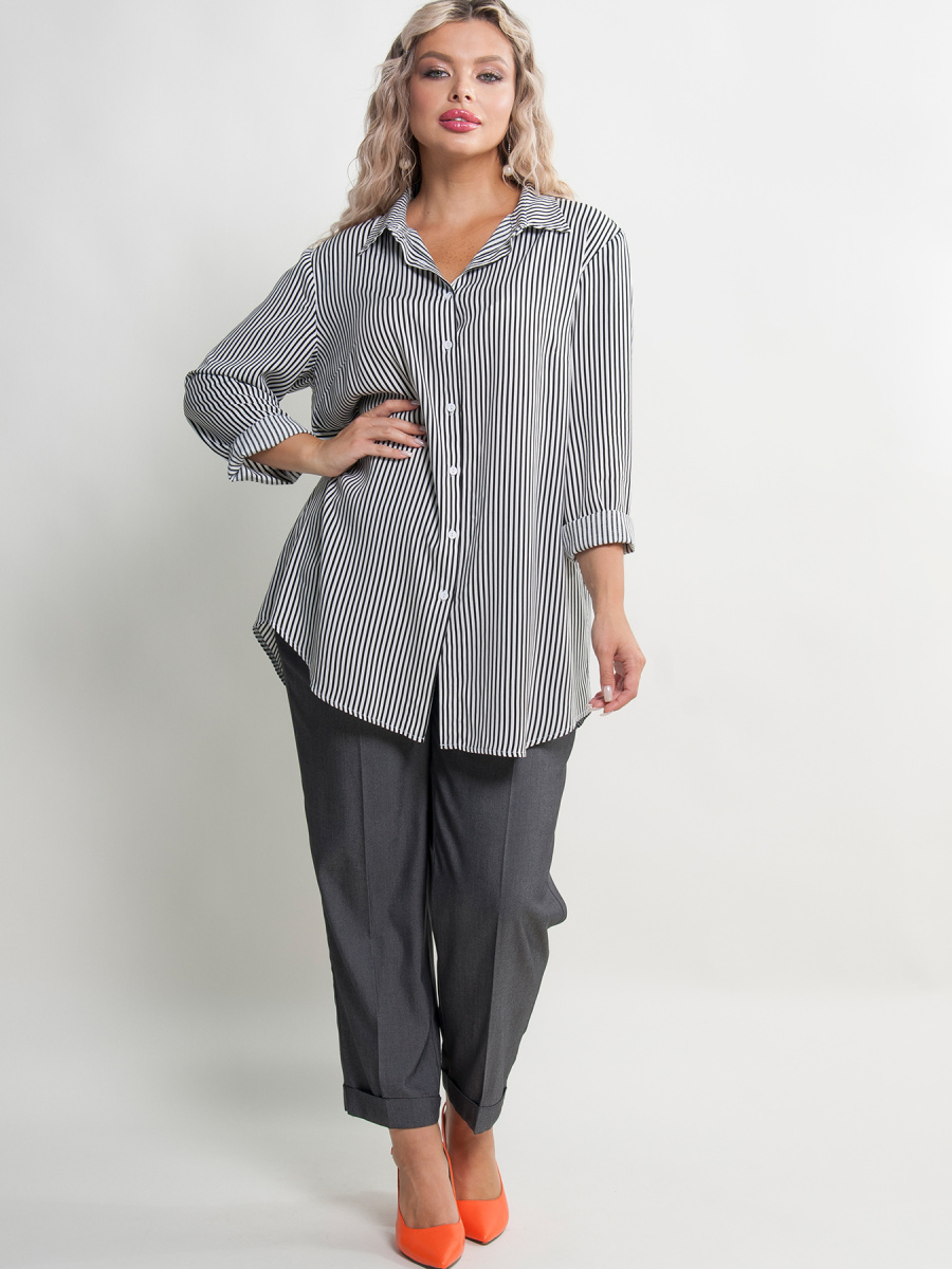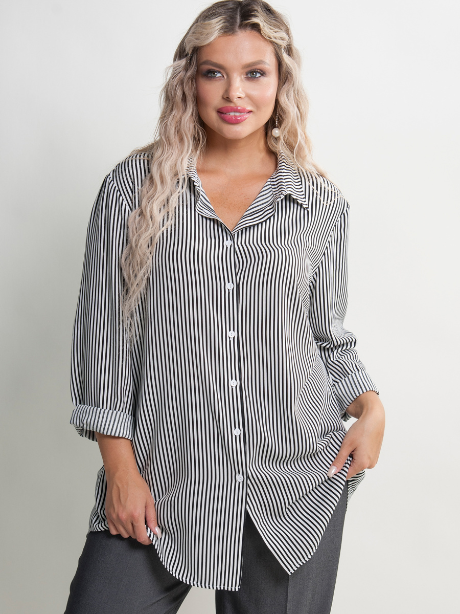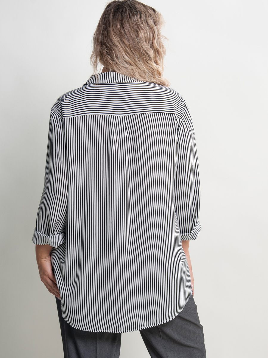 Рубашка женская в полоску прямого силуэта. Длинные втачные рукава оканчиваются манжетами с застежкой на пуговицу. Горловина оформлена классическим воротником на стойке, переходящим в планку с застежкой на пуговицы. Спинка дополнена кокеткой со складкой. Низ фигурный, с закруглениями по бокам.