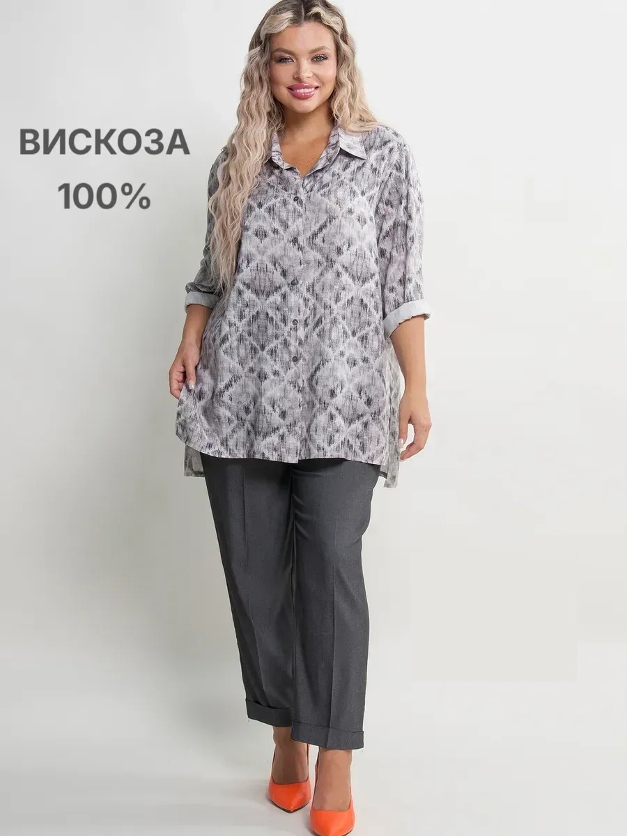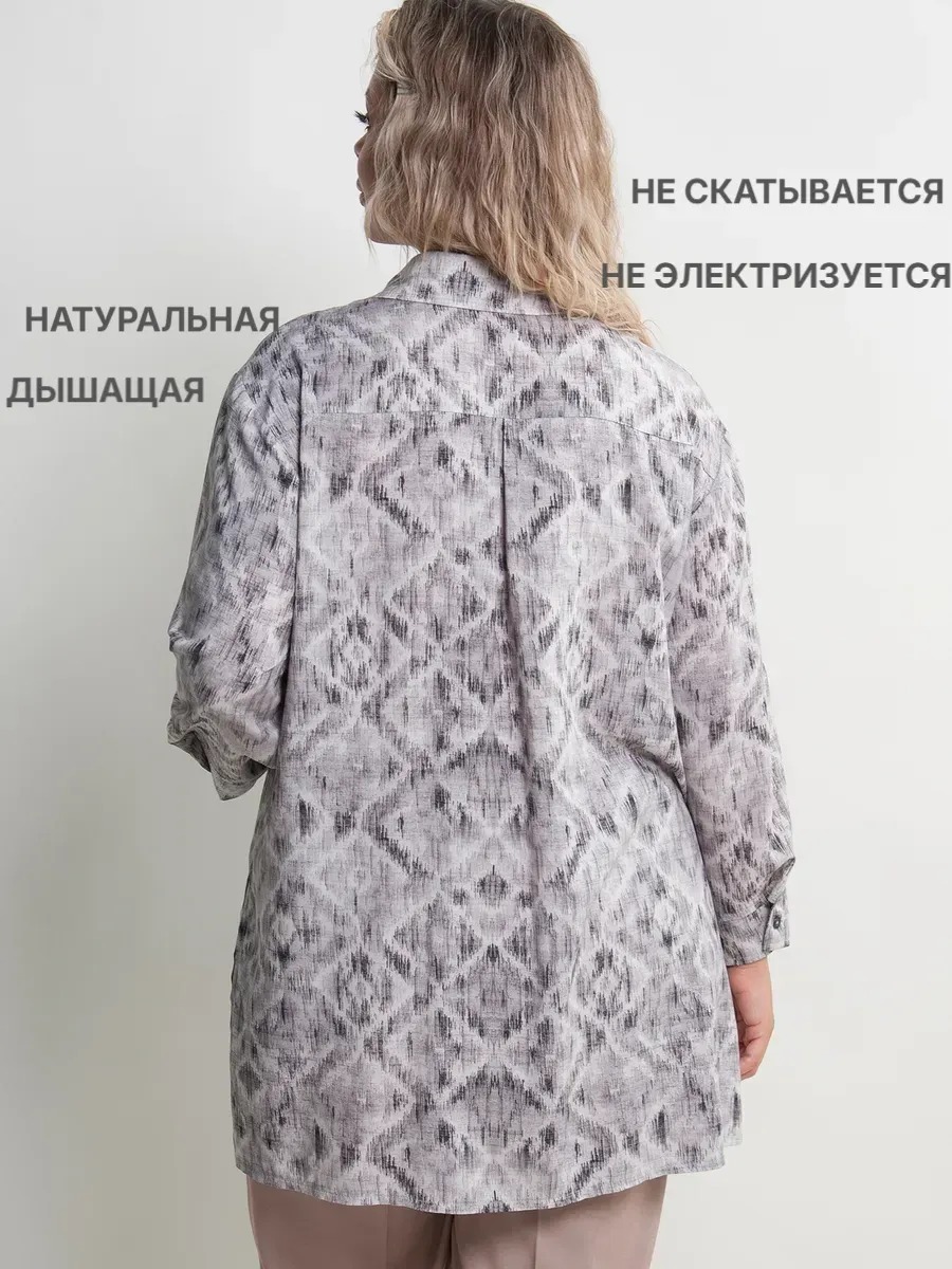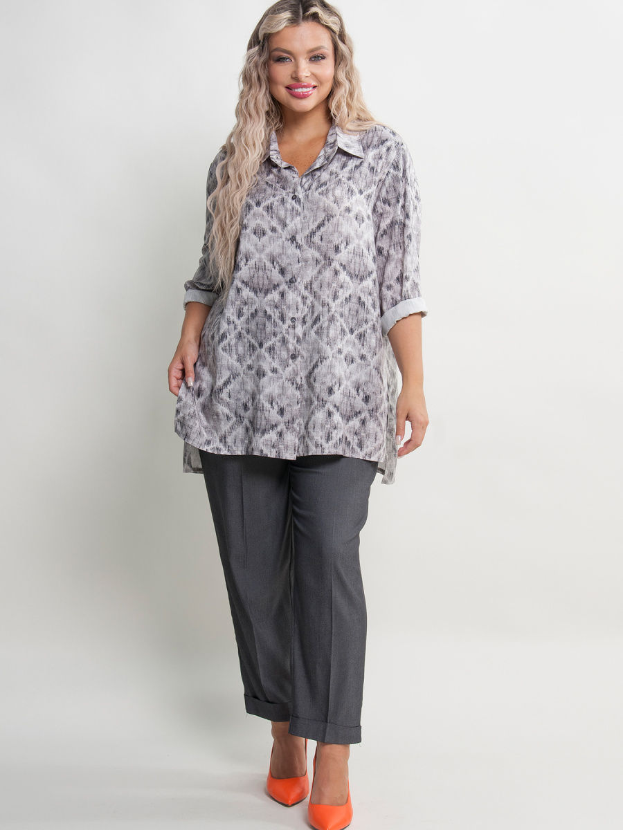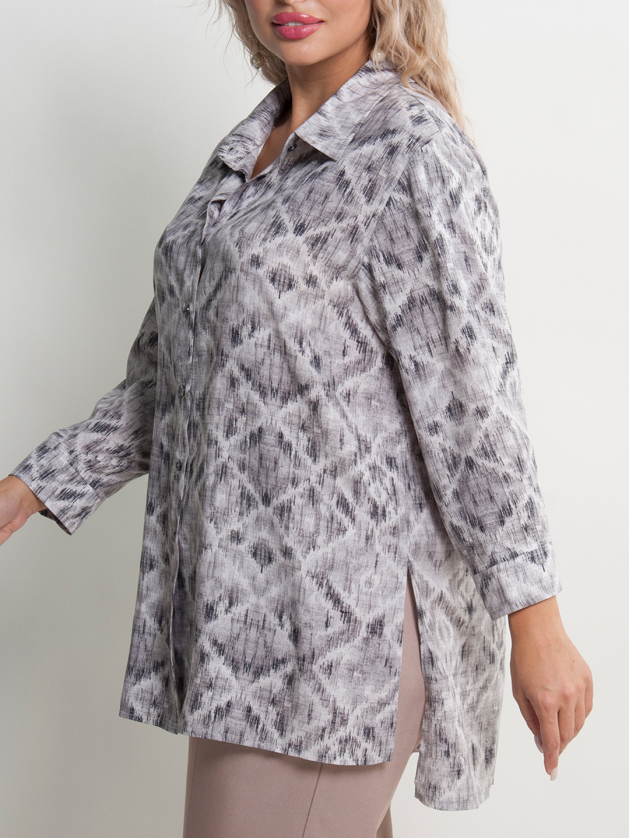 Рубашка женская прямого силуэта с удлиненной спинкой и боковыми разрезами. Модель имеет рубашечный отложной воротник и рукава 3/4 на манжете. По центру застежка на пуговицы. Сзади кокетка с центральной складкой.