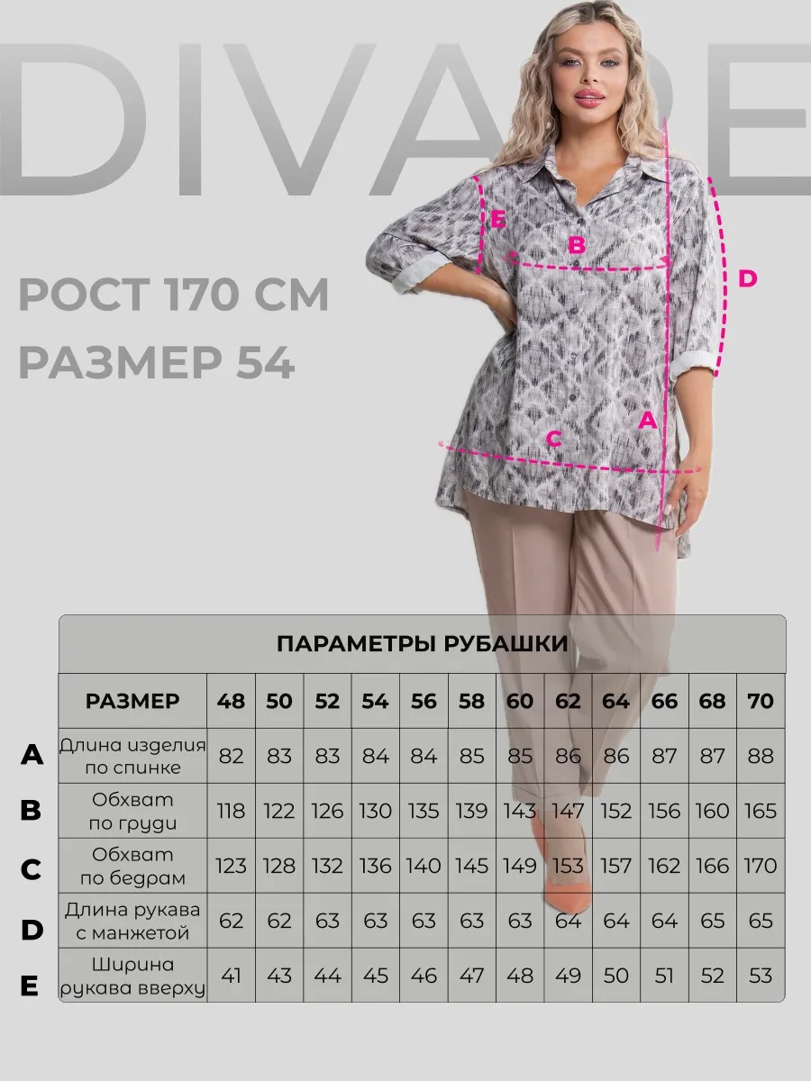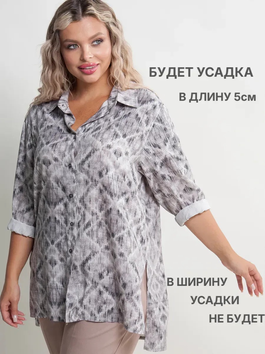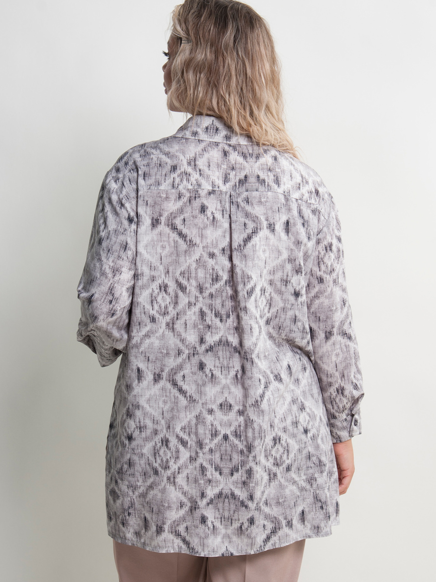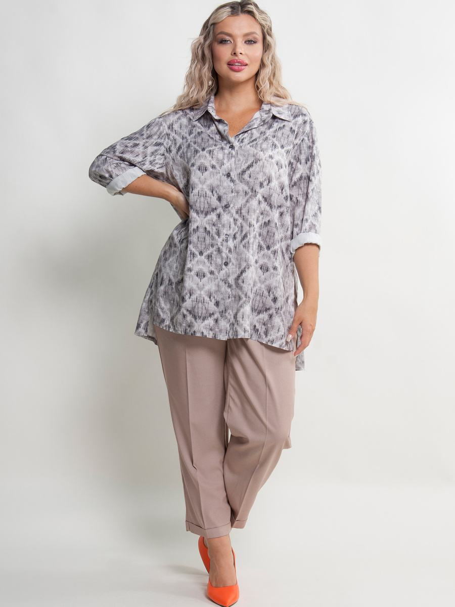Рубашка женская прямого силуэта с удлиненной спинкой и боковыми разрезами. Модель имеет рубашечный отложной воротник и рукава 3/4 на манжете. По центру застежка на пуговицы. Сзади кокетка с центральной складкой.