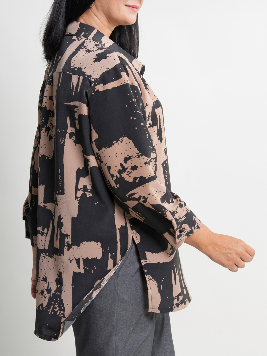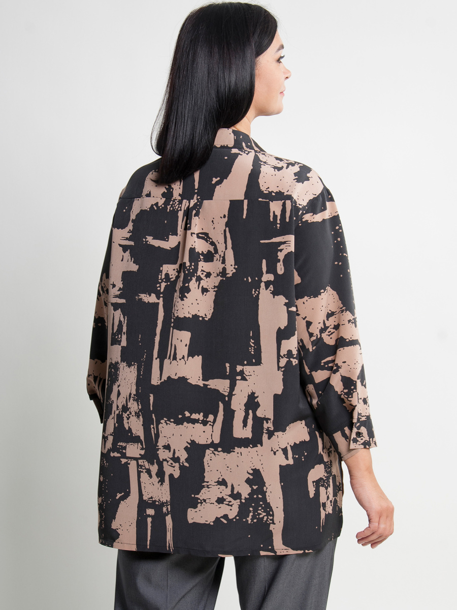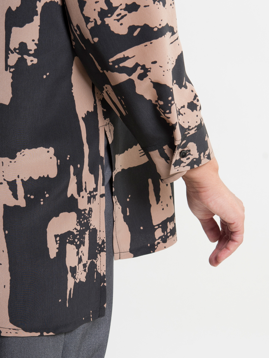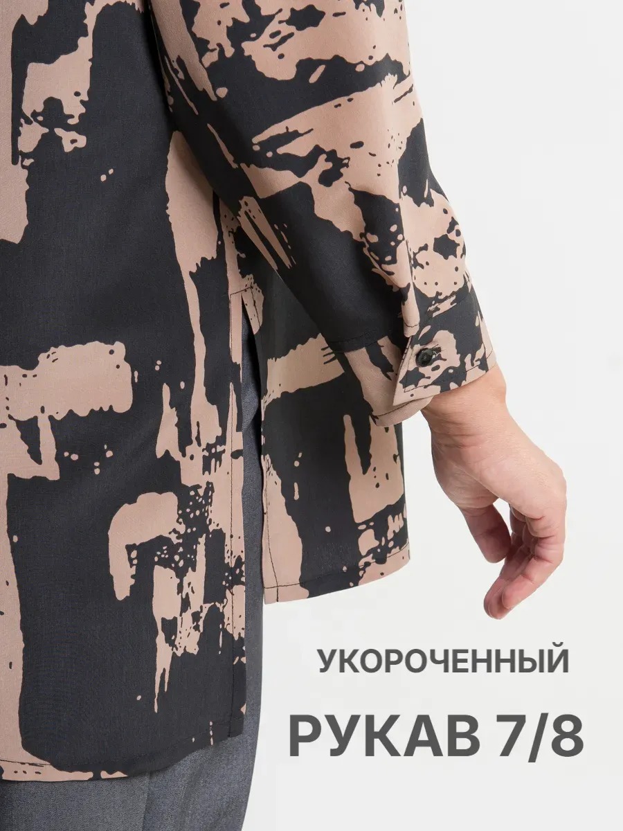 Рубашка женская прямого силуэта с удлиненной спинкой и боковыми разрезами. Модель имеет рубашечный отложной воротник и рукава 3/4 на манжете. По центру застежка на пуговицы. Сзади кокетка с центральной складкой.
