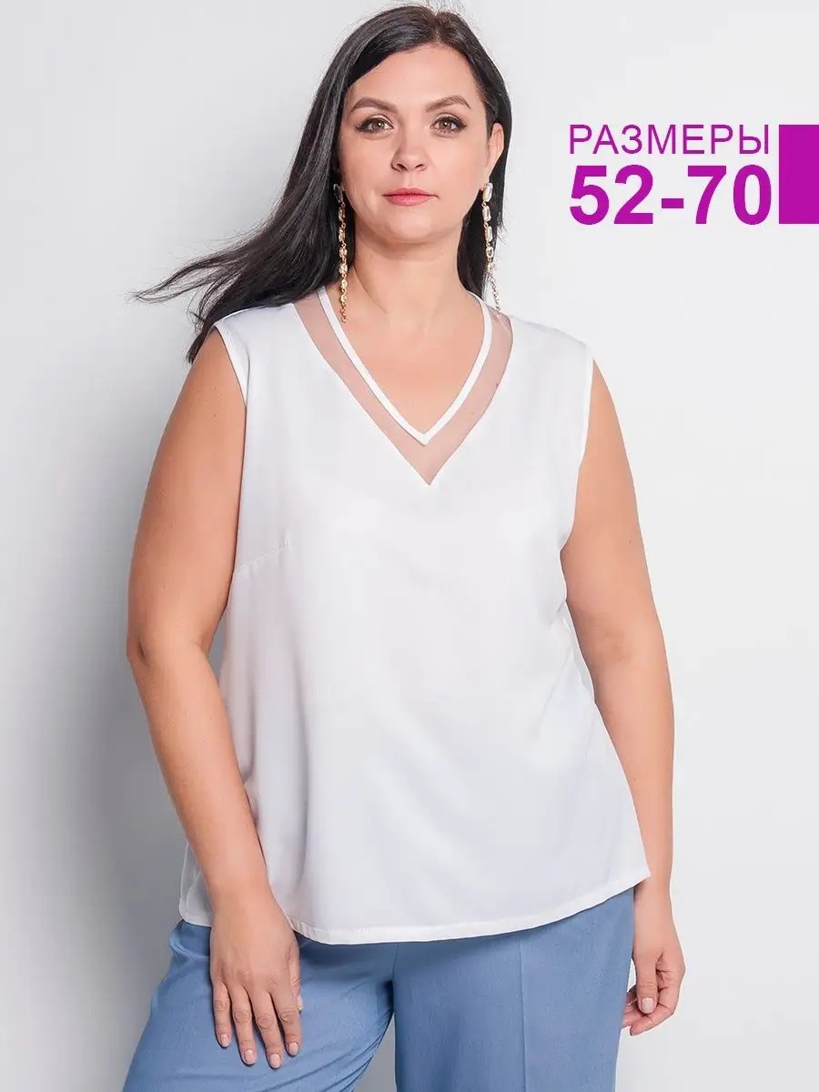 Топ женский прямого силуэта. Модель с V-образным вырезом горловины. Перед изделия декорирован вставкой из сетки.