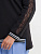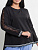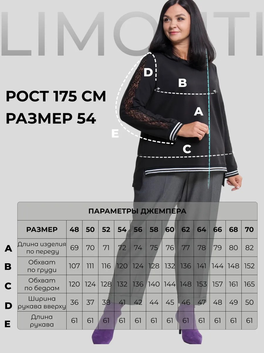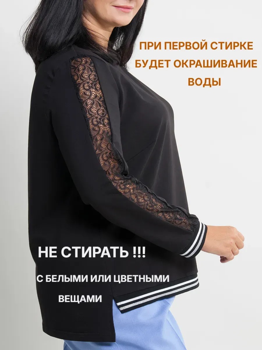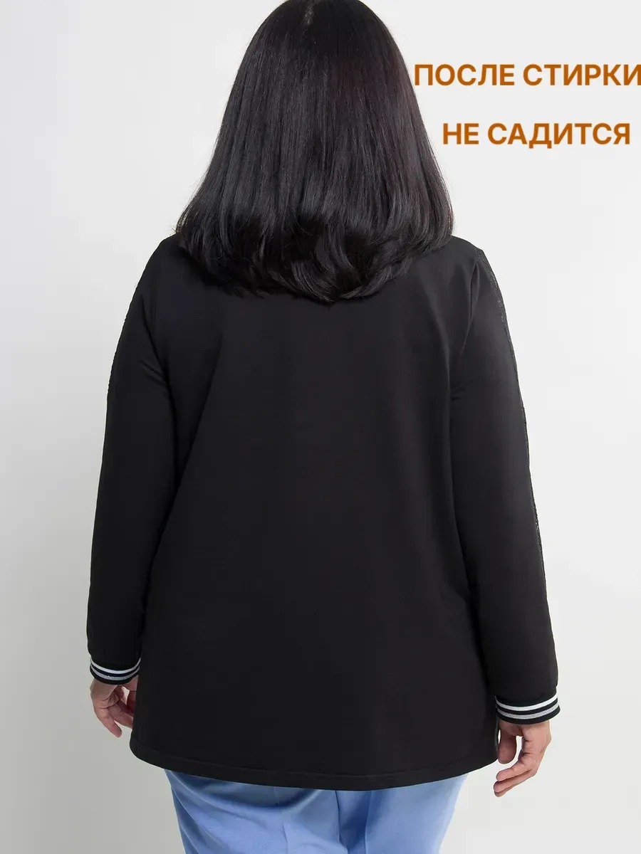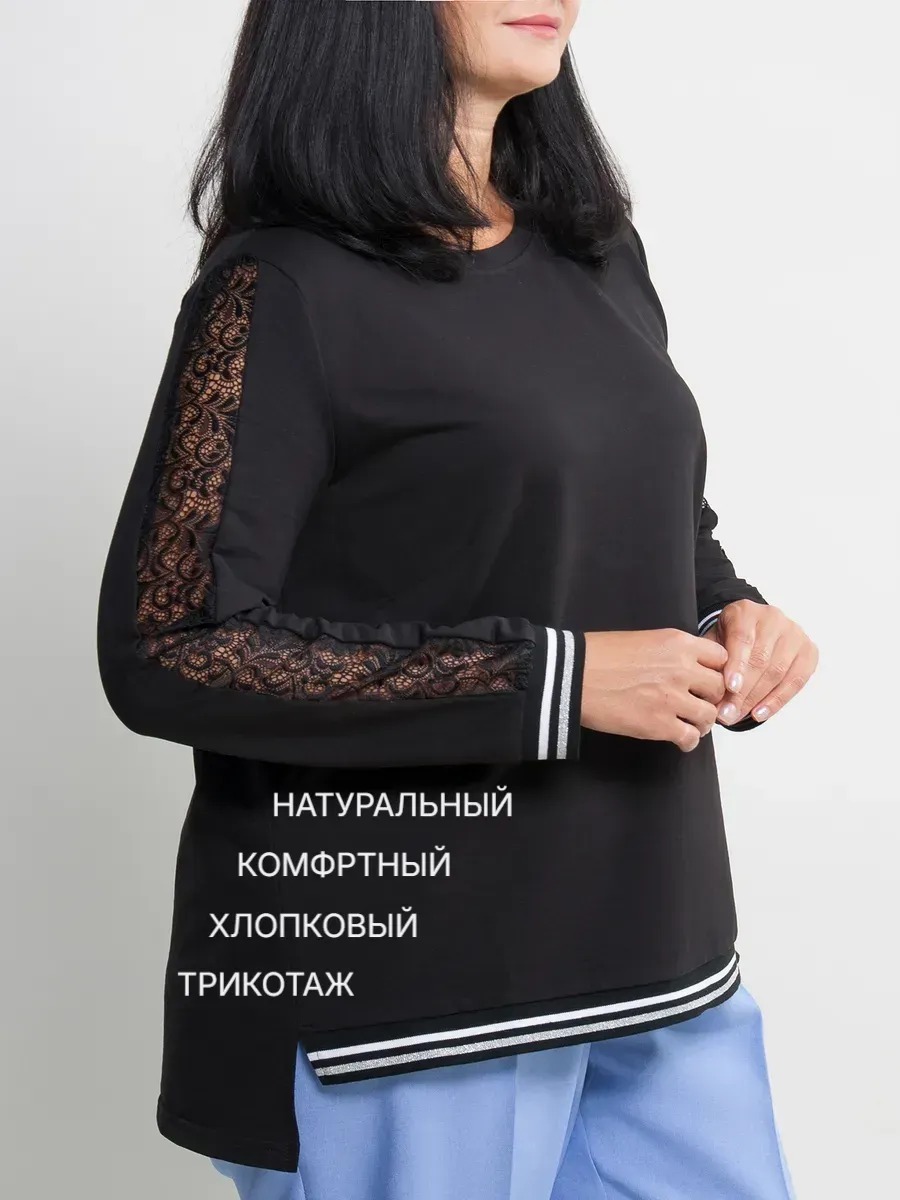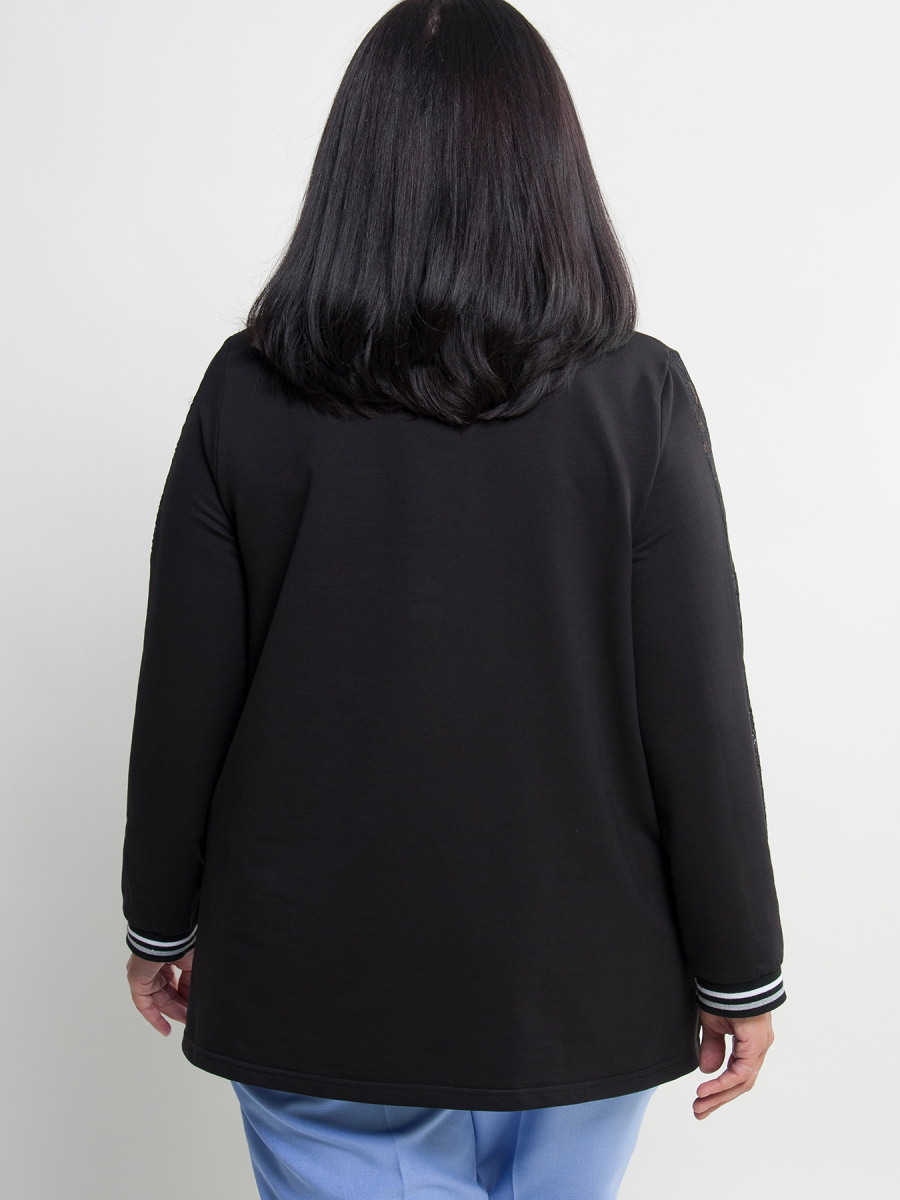Джемпер женский трикотажный прямого силуэта с длинными рукавами имеющими по центру ажурную вставку. Модель с круглым вырезом горловины и удлиненной спинкой. Рукава и перед оформлены контрастными лампасами.