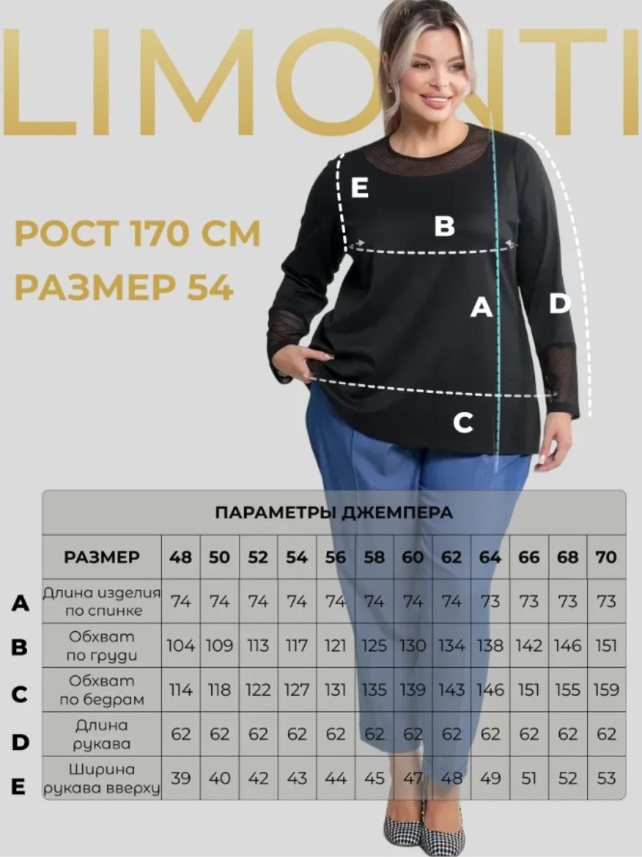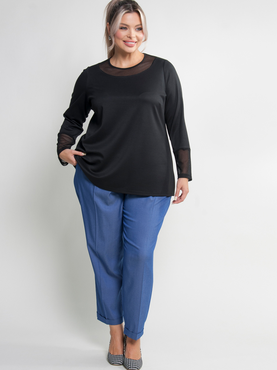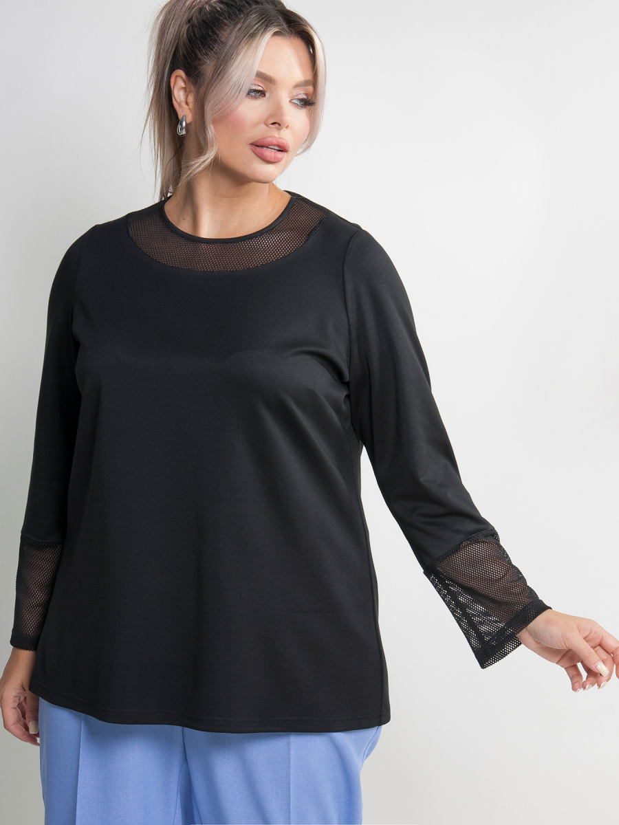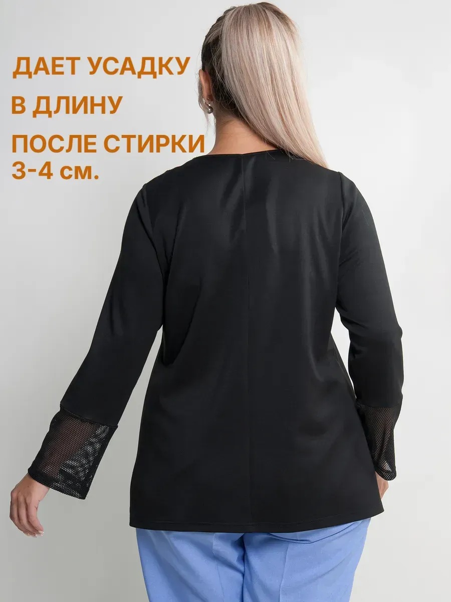 Джемпер женский больших размеров с длинным рукавом выполнен из трикотажа с отделкой из сетки на рукавах и горловине. Модель свободная, удлиненная и без застежки. Ткань трикотажная, вискозная, тактильно приятная к телу. После длительной носки джемпер будет сохранять форму.