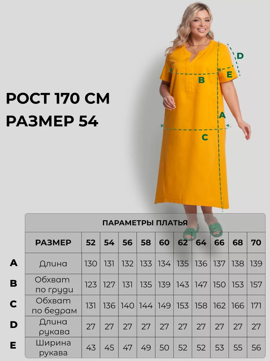 Платье женское А-образного силуэта, длиной до середины икры. Модель имеет фигурный вырез горловины и короткие втачные рукава. На полочке расположены накладные карманы. Без застежки.