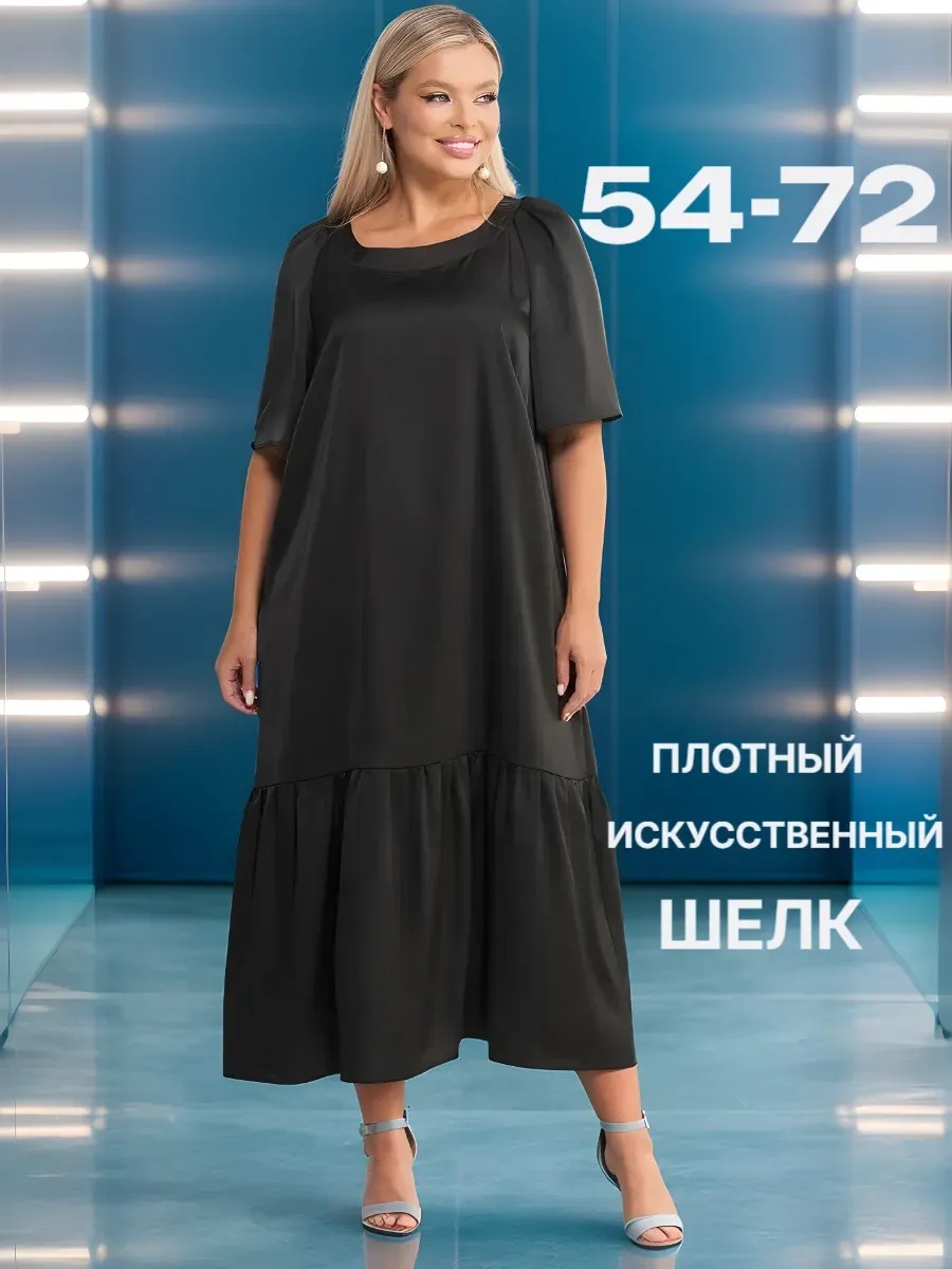 Платье женское А-образного силуэта, с воланом по низу и сборкой на рукавах. Без застёжки. Декор в виде воланов придает платью романтичности и женственности.