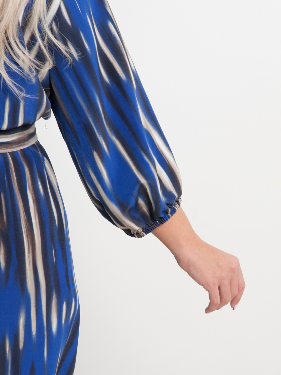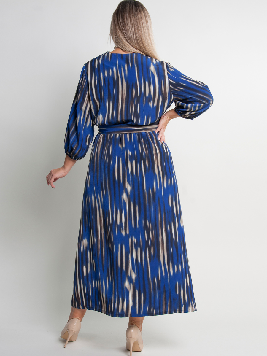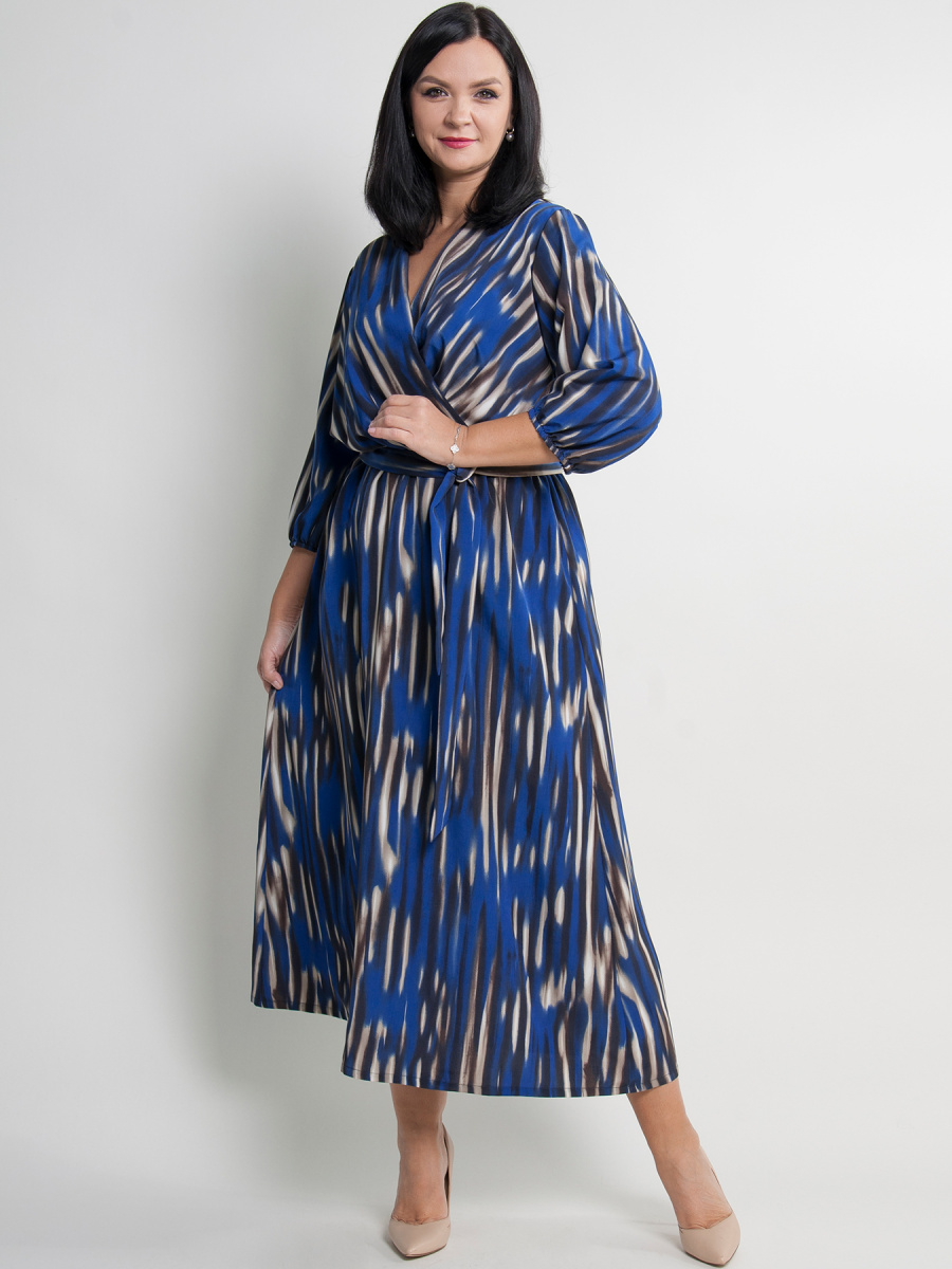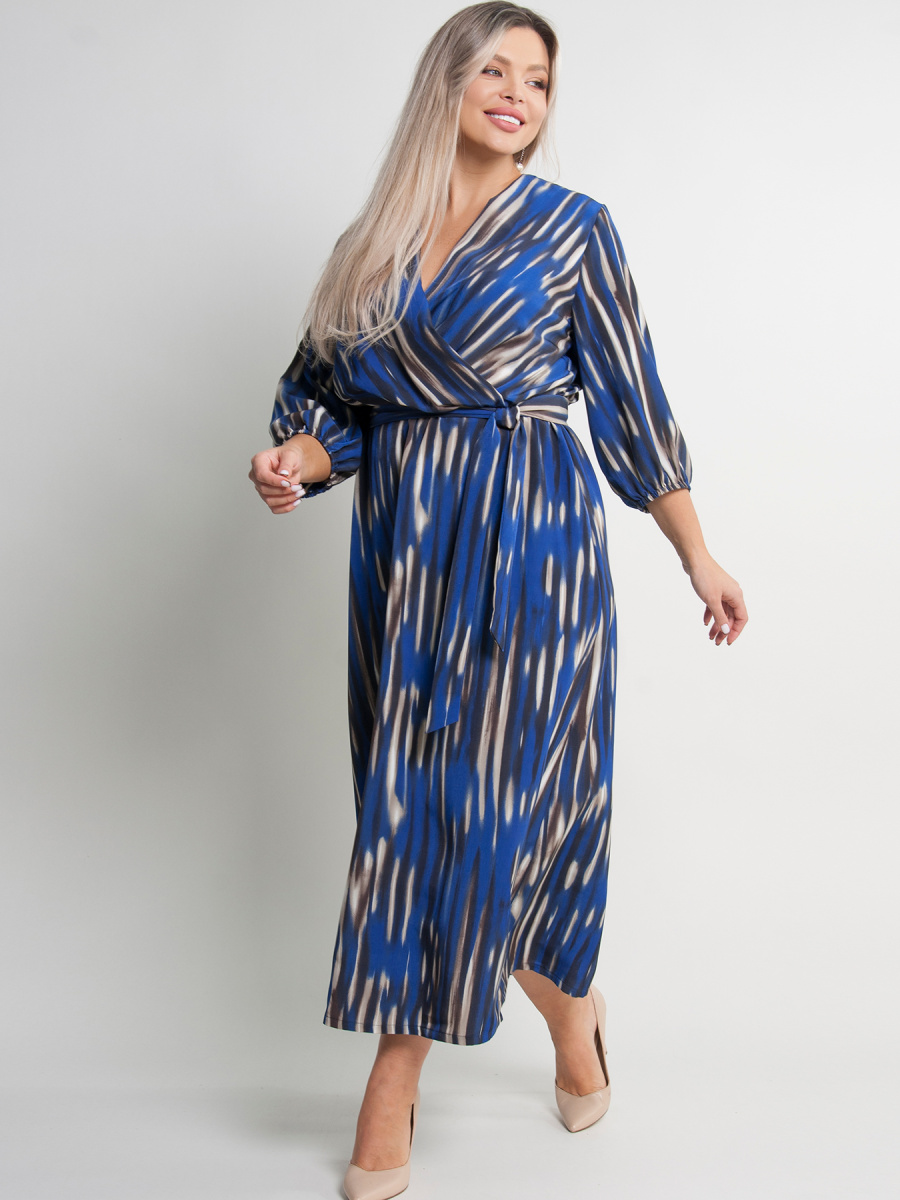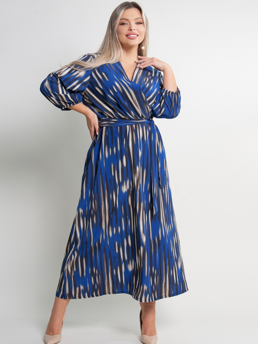 Платье женское с запАхом, выполненное из шелковистой ткани кашибао. Модель А-силуэта, с V-образным вырезом горловины и рукавами 3/4 собранными по низу на резинку. По талии - сборка на резинку. В комплект входит пояс из основной ткани, который отлично подчеркнет линию талии.