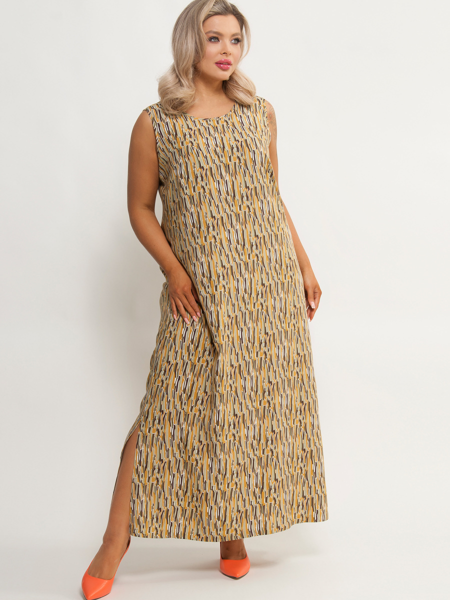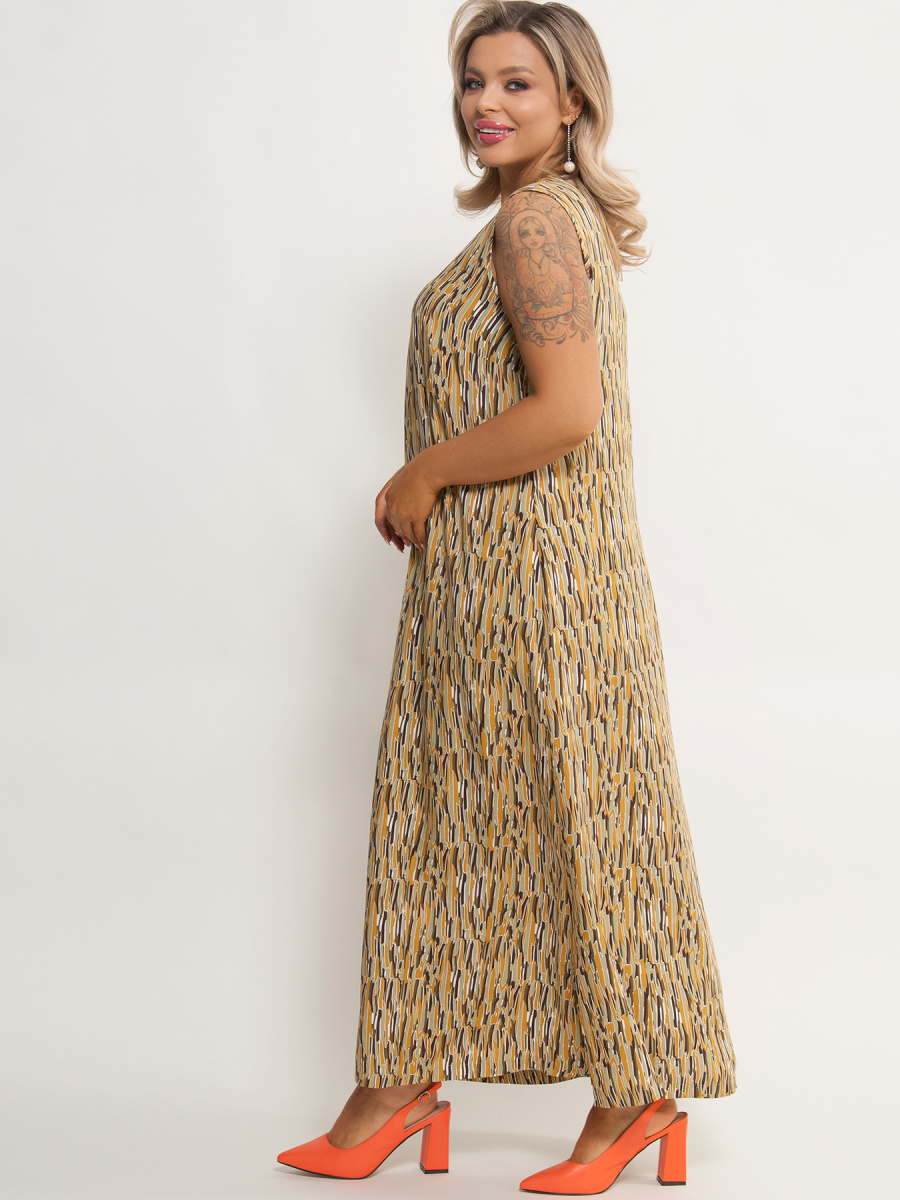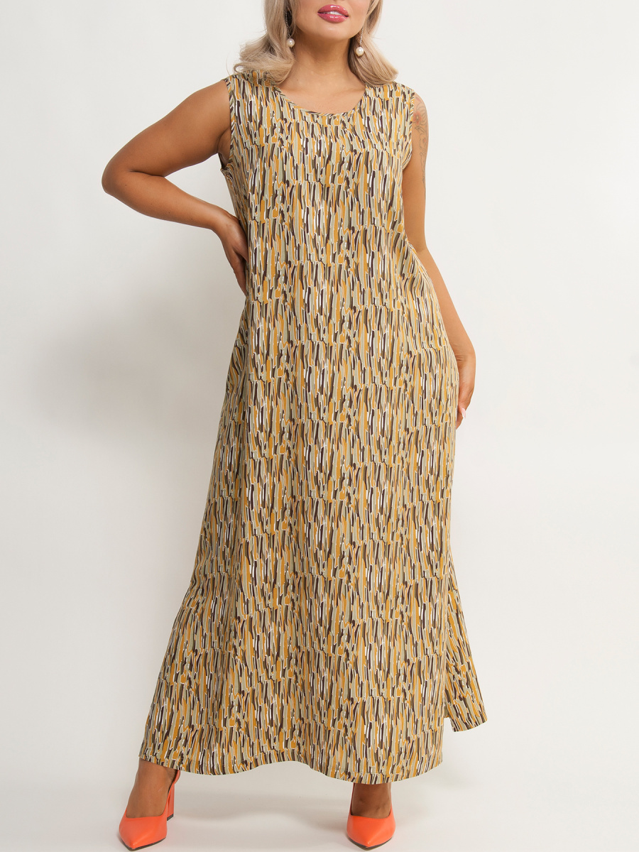 Сарафан женский А-силуэта, без рукавов, имеет круглый вырез горловины, по бокам разрезы. Без застежки.