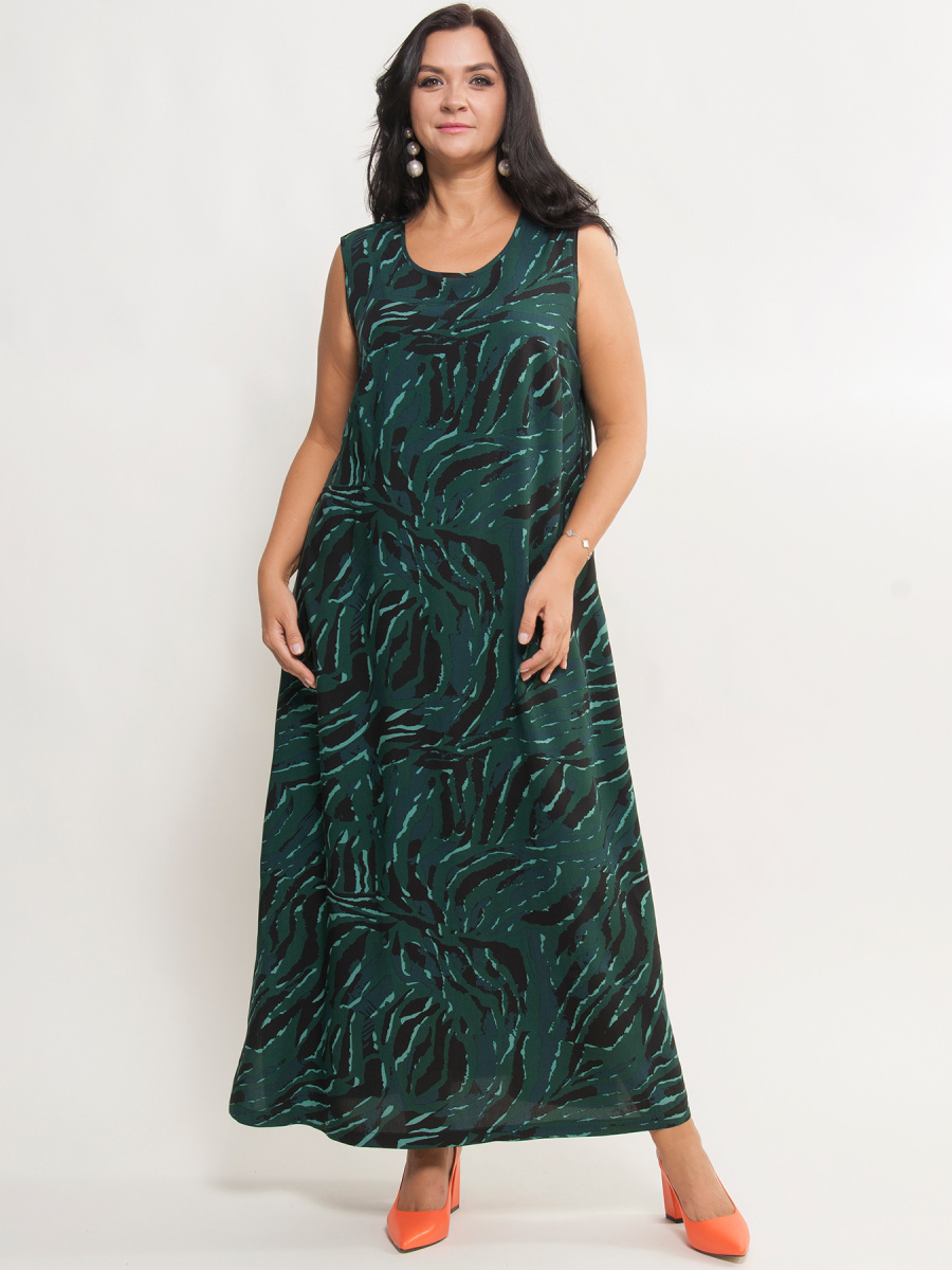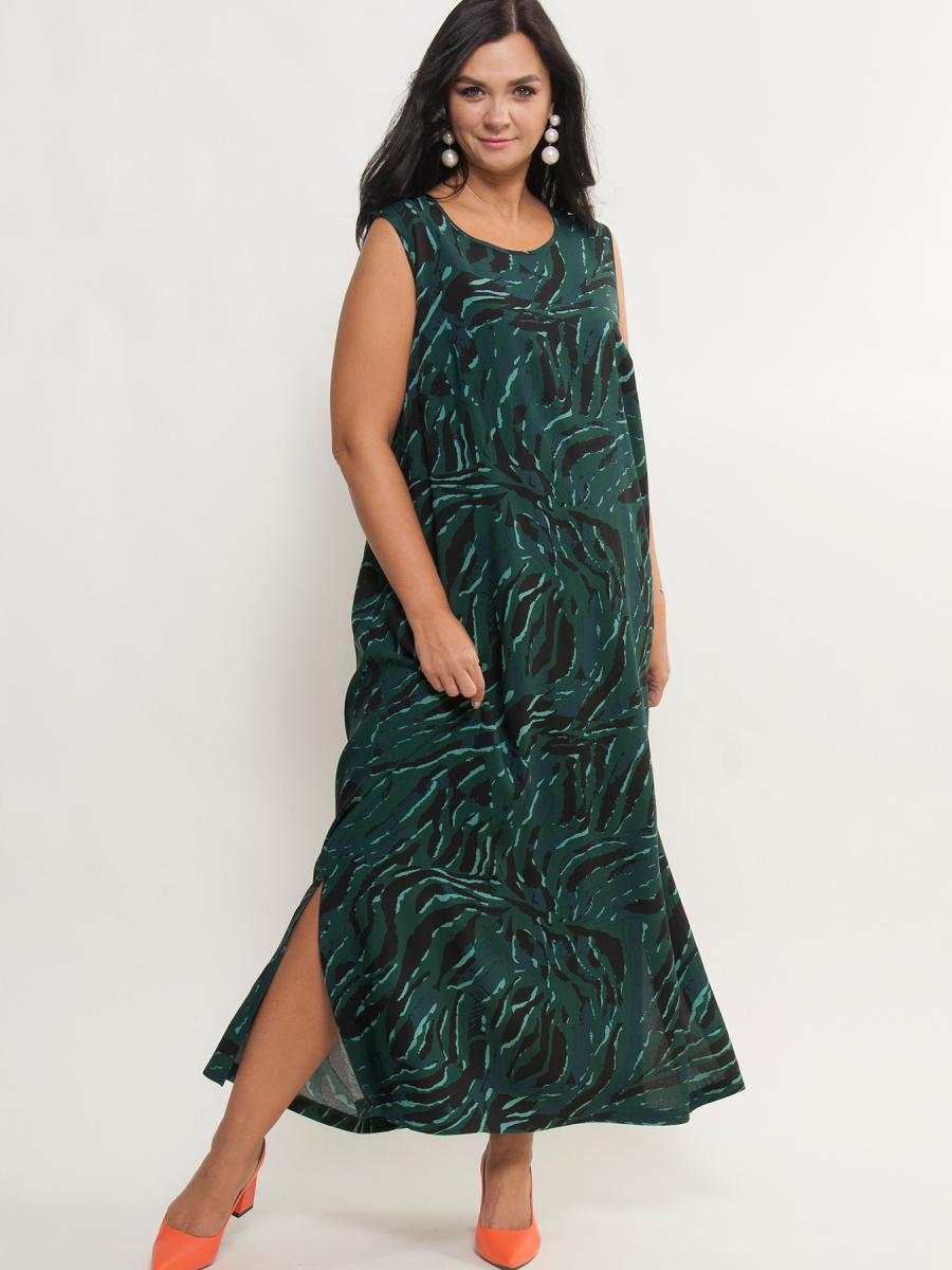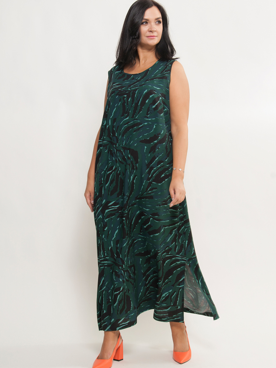 Сарафан женский А-силуэта, без рукавов, имеет круглый вырез горловины, по бокам разрезы. Без застежки.