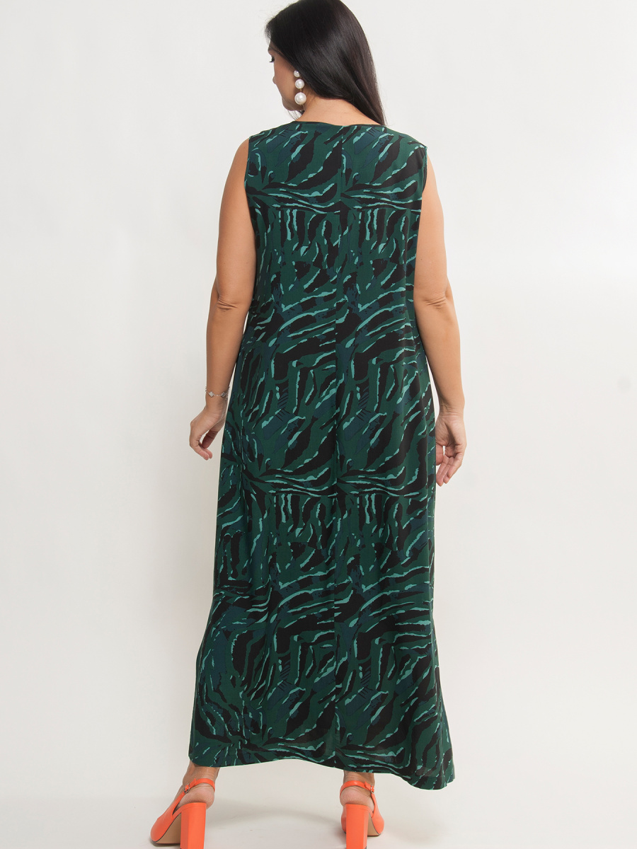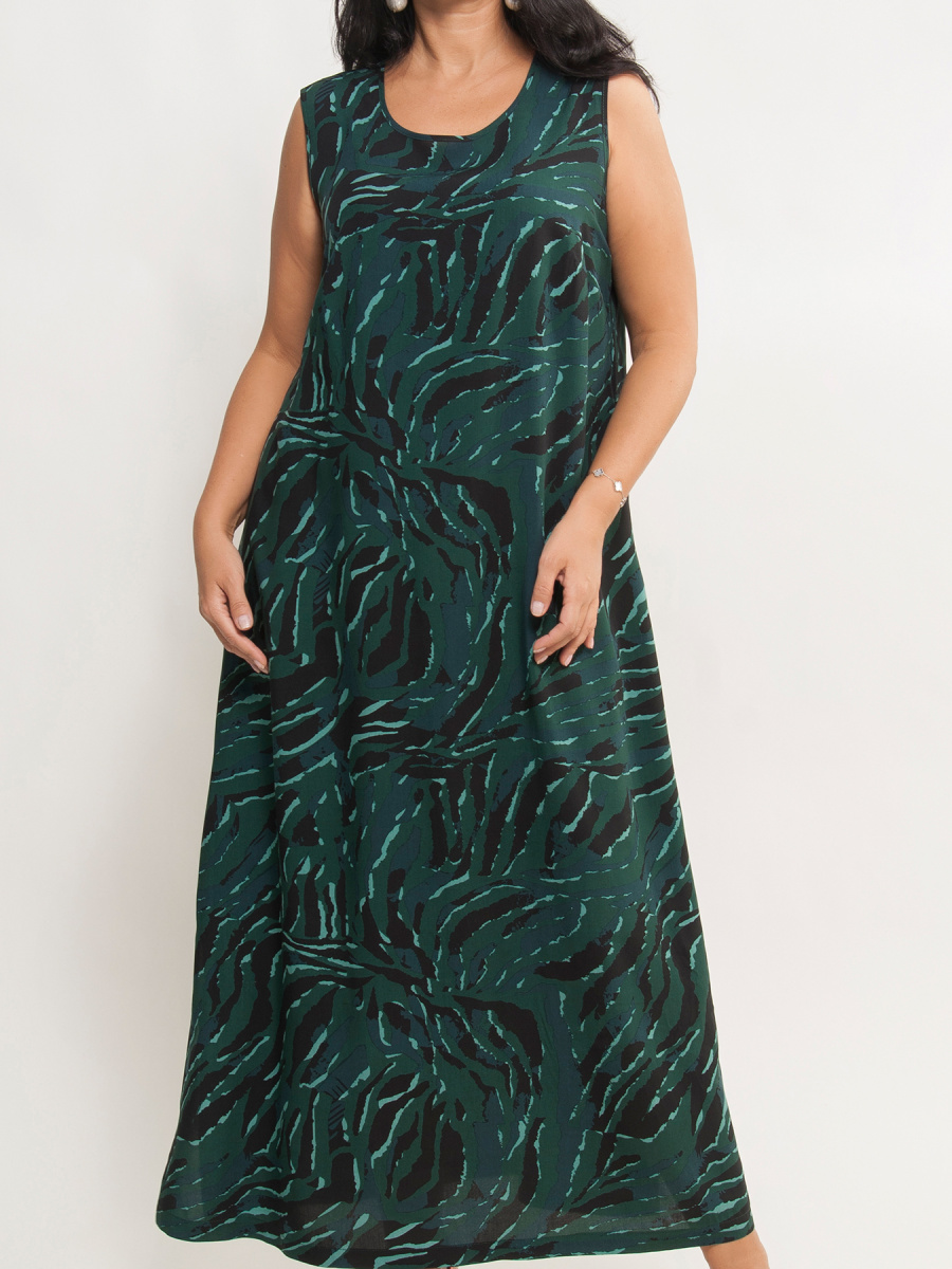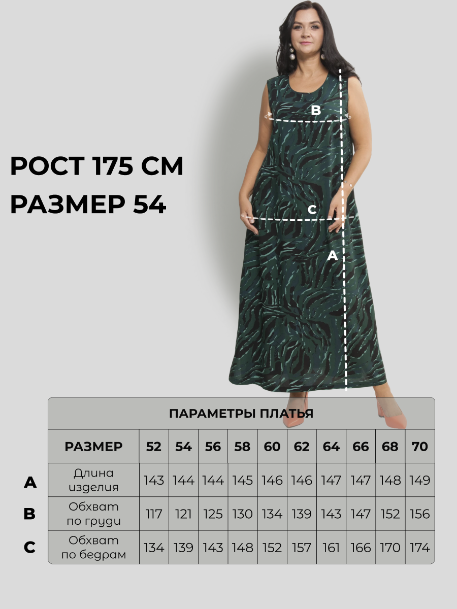 Сарафан женский А-силуэта, без рукавов, имеет круглый вырез горловины, по бокам разрезы. Без застежки.