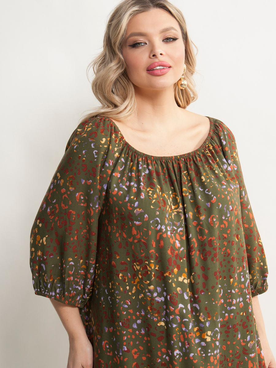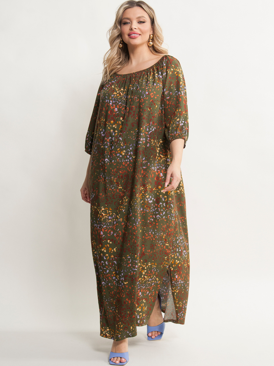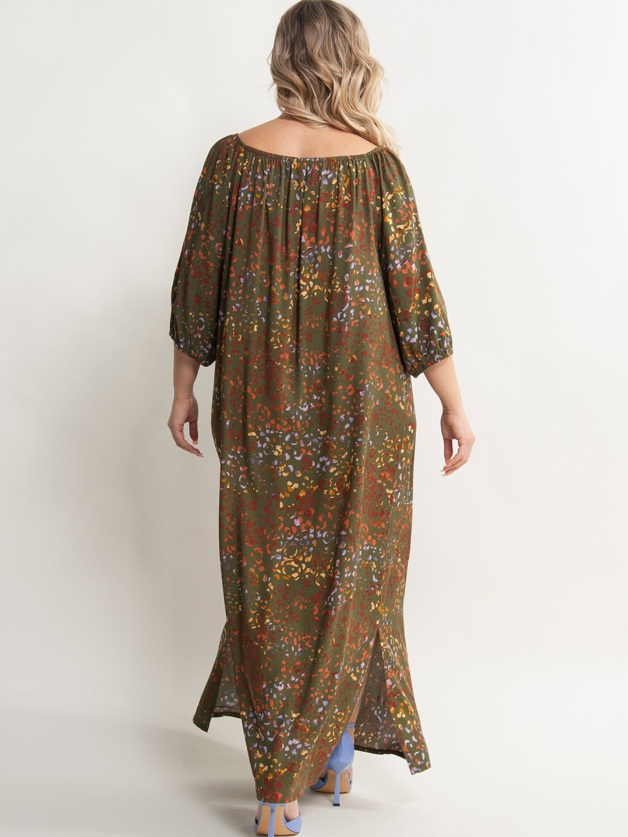 Платье женское А-образного силуэта, выполненное из штапеля. Верх платья на резинке, которая позволяет регулировать вырез от круглого до открытых плеч Рукава 3/4 на резинке. По бокам разрезы. Уникальный дизайн платья придаст Вашему гардеробу особый шарм