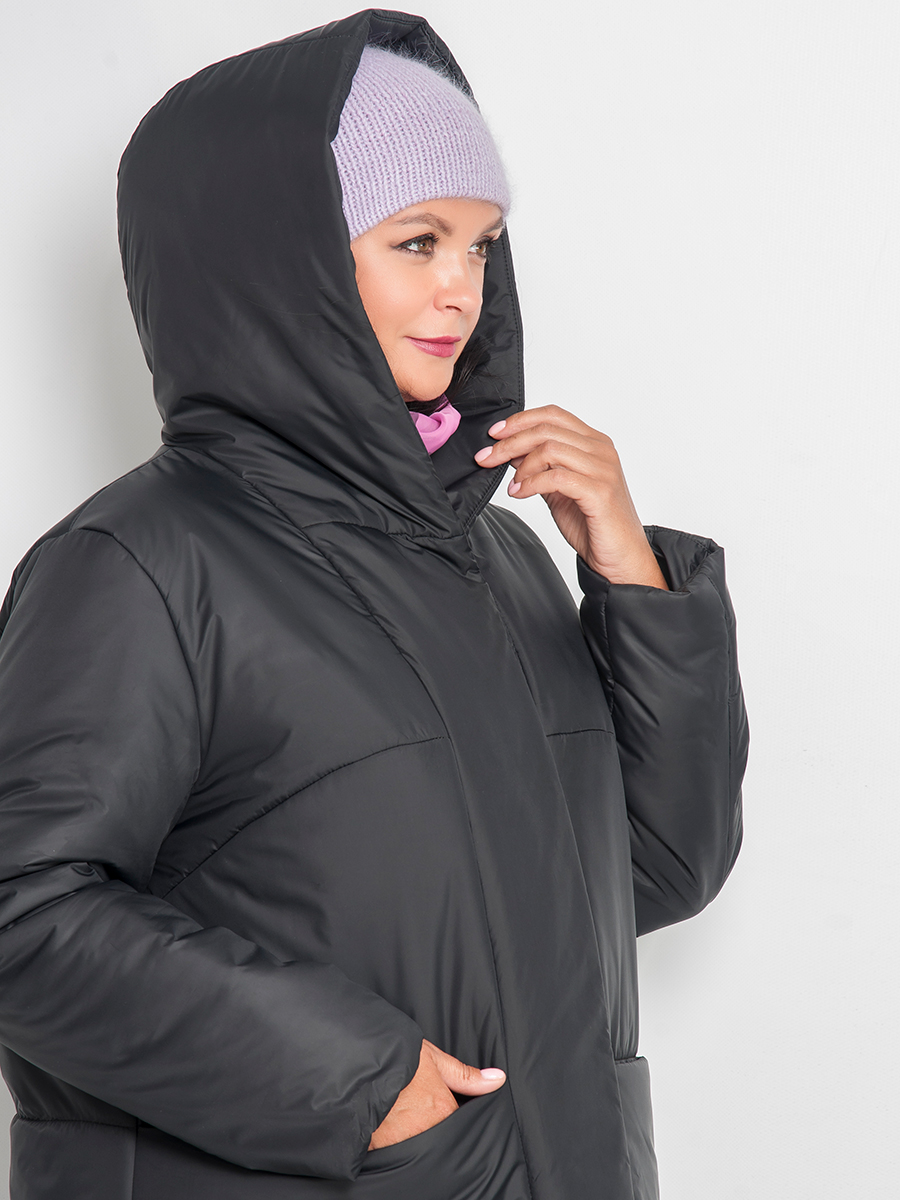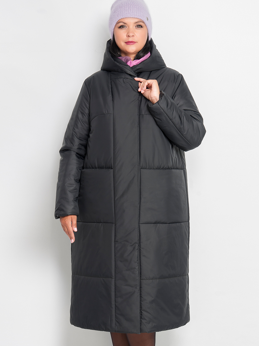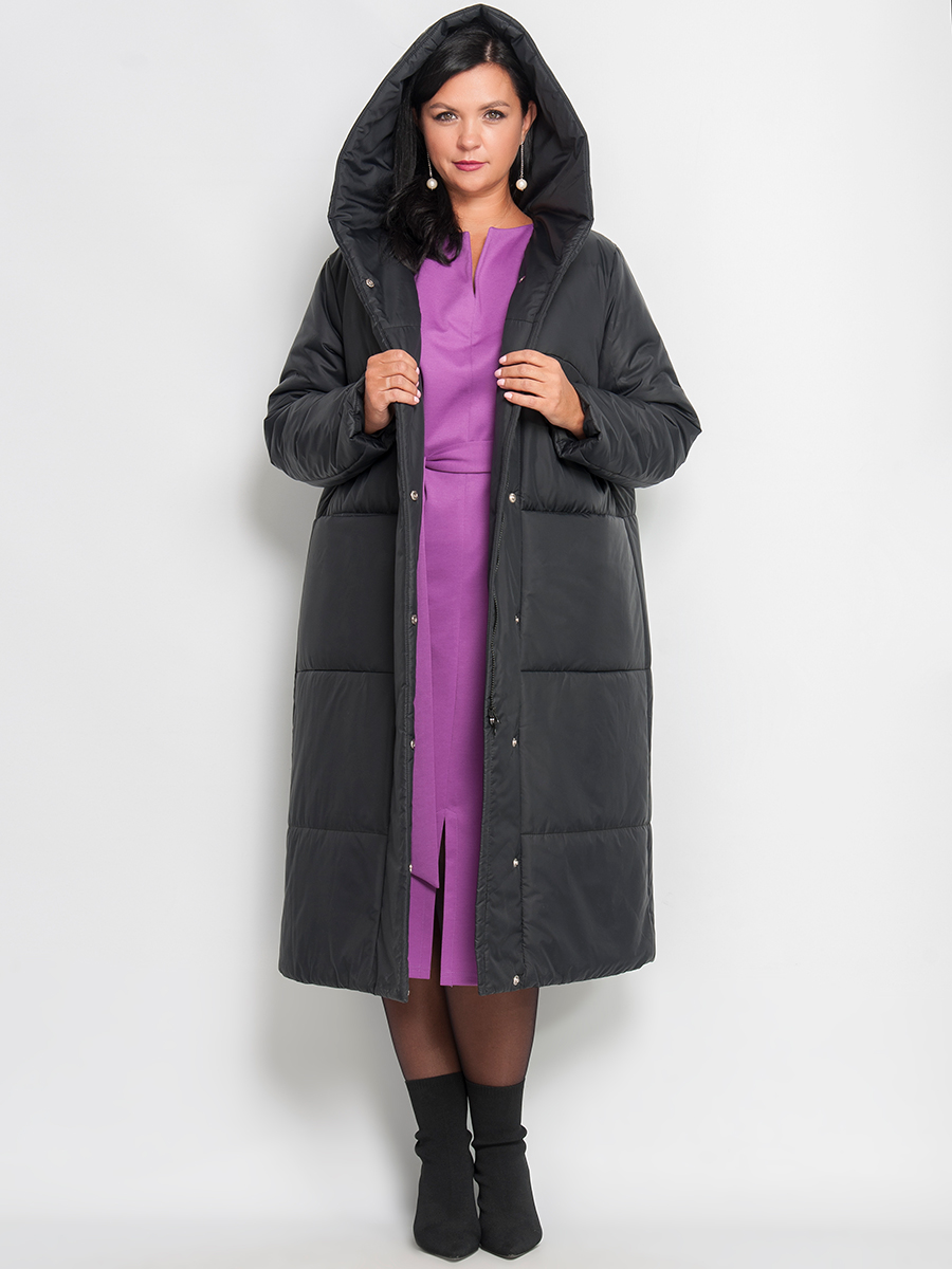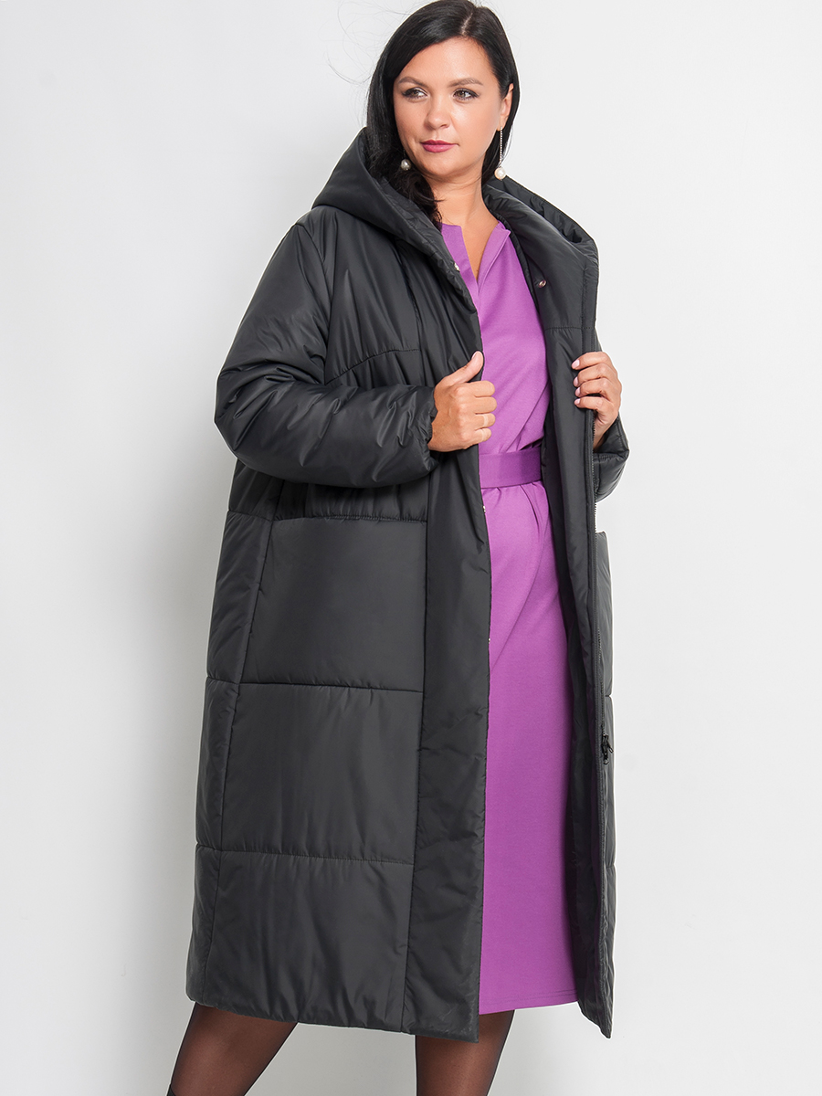 Пальто женское с капюшоном прямого силуэта с утеплителем из слайтекса. По центру застежка на молнию и кнопки. Модель имеет вшитые боковые карманы.