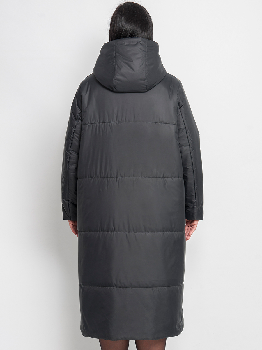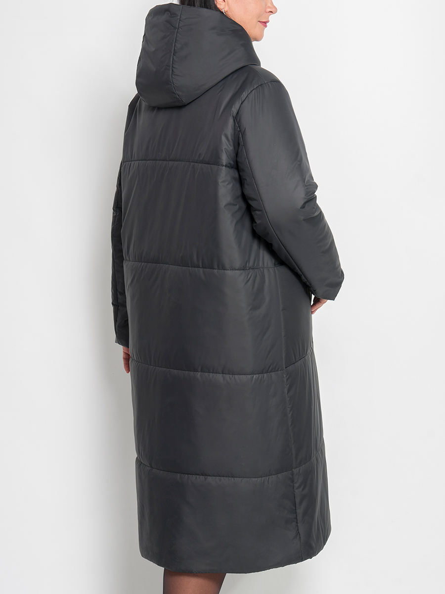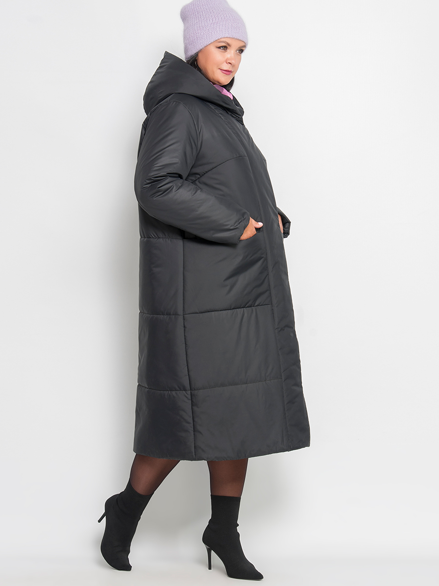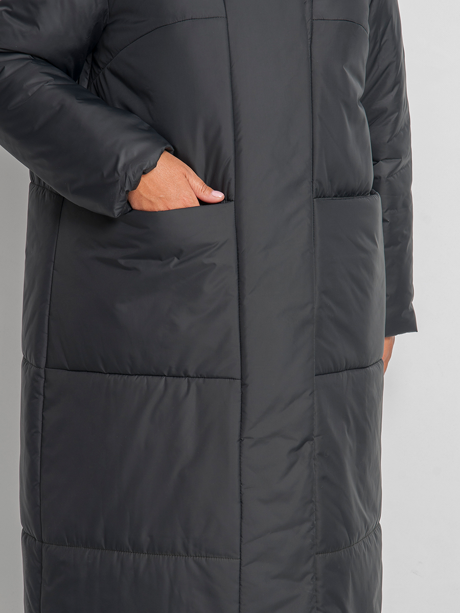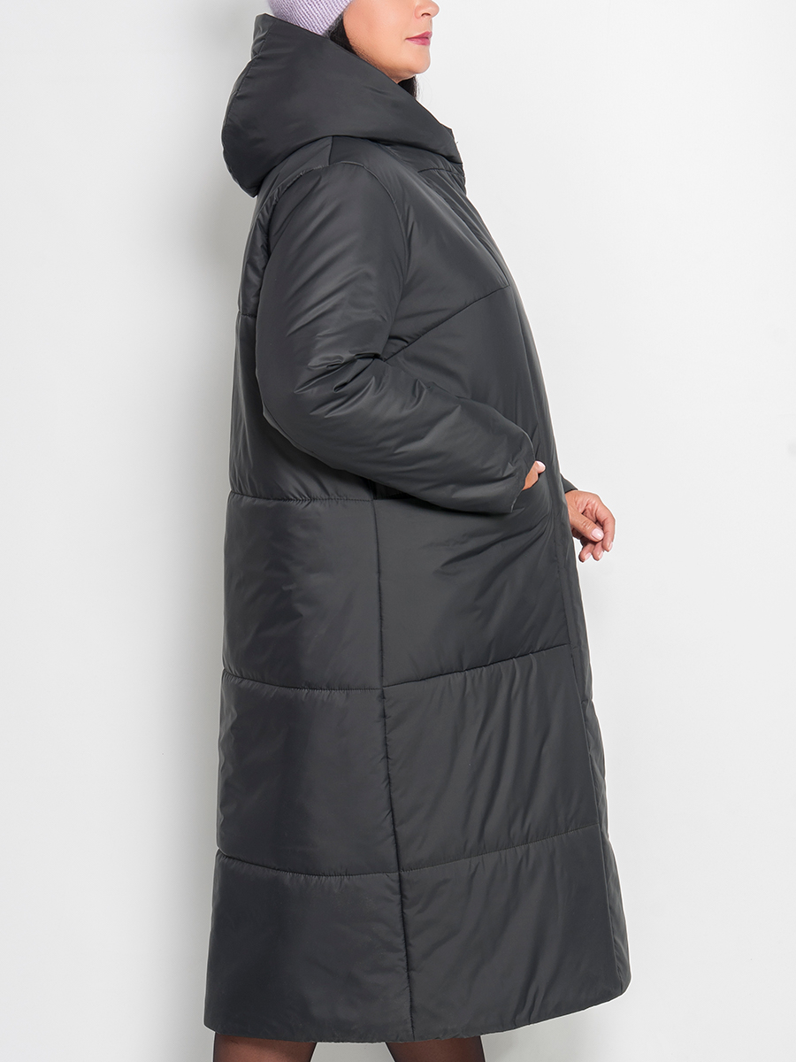 Пальто женское с капюшоном прямого силуэта с утеплителем из слайтекса. По центру застежка на молнию и кнопки. Модель имеет вшитые боковые карманы.